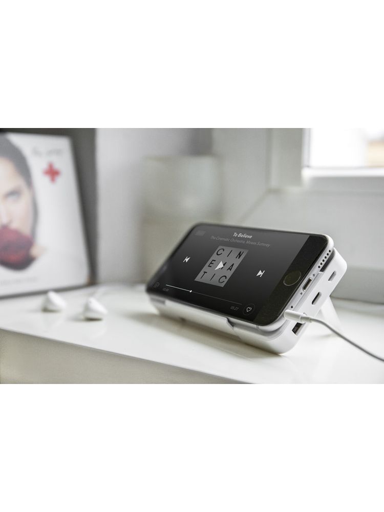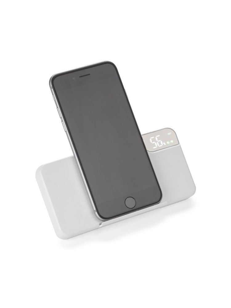Power bank STAND wyróżnia się bardzo praktyczną funkcją stojaka na telefon. Poza tym posiada wbudowaną ładowarkę bezprzewodową o mocy 5W. Dzięki tym obu funkcjom można oglądać film na telefonie, jednocześnie ładując jego baterię bez żadnych kabli! Power bank wyposażony został również w cyfrowy wyświetlacz, który pokazuje aktualny poziom naładowania baterii i rodzaj ładowania. W zestawie standardowy kabel micro USB do ładowania. Produkt jest zgodny z odpowiednimi dyrektywami Unii Europejskiej, posiada znak CE oraz 1 rok gwarancji. Dane techniczne: wejście (micro USB i USB typu C) 5V/2A, wyjście USB 5V/2.1A (max), bateria litowo-polimerowa