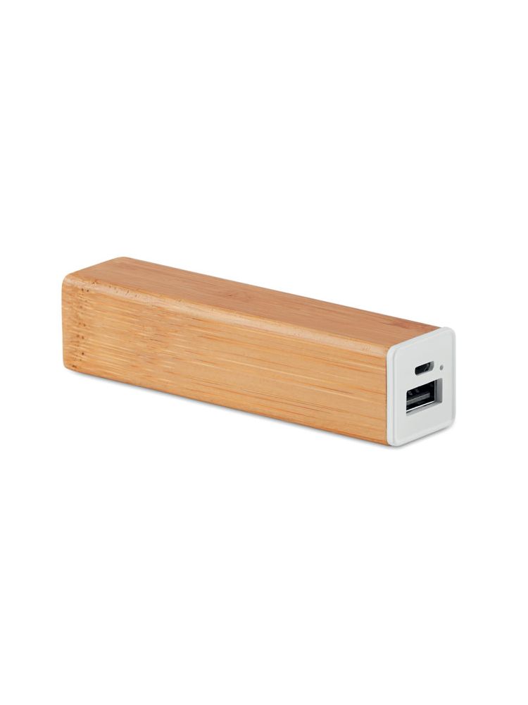 Powerbank 2200 mAh w obudowie bambusowej. Pojemność dla smartfonów, DC5V/1A. Zawiera lampkę wskazującą i kabel USB z wtyczką micro USB. Zawiera złącze typu C. Bambus jest produktem naturalnym, dlatego mogą wystąpić nieznaczne różnice w kolorze, wzorze i rozmiarze.