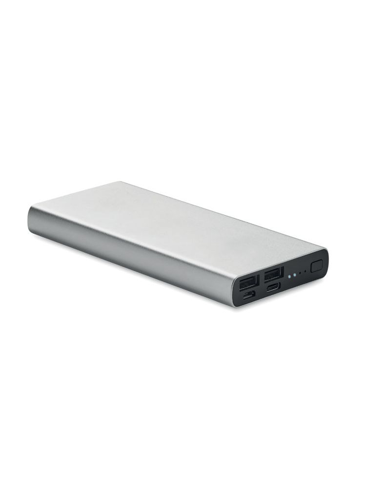 Power bank 10000 mAh z aluminium pochodzącego z recyklingu. Pojemność do smartfonów, prąd wyjściowy DC5V/1A i DC5V/2A. Zawiera lampkę kontrolną i kabel USB z wtyczką micro USB. Obsługuje technologię szybkiego ładowania (18 W). Wejście/wyjście: Typ-C. Obsługa Power Delivery (PD) do ładowania najnowszego laptopa MacPro®.