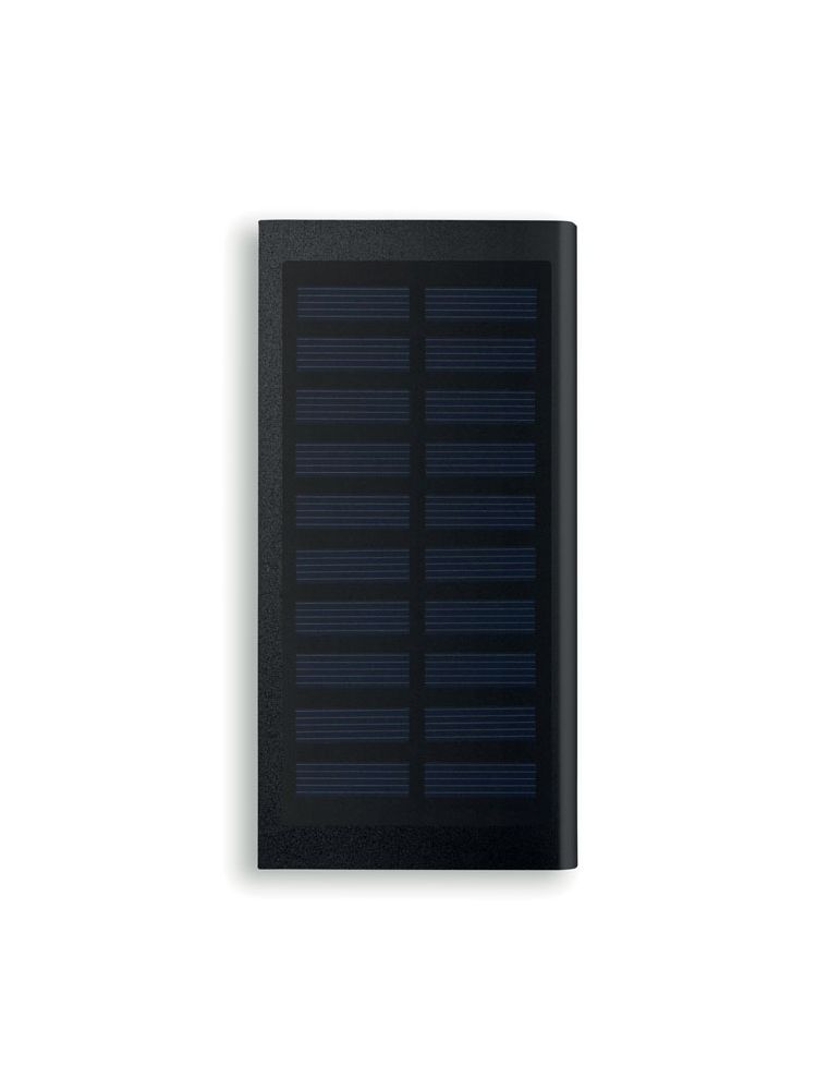 Power bank 8000 mAh z aluminium z recyklingu i panelem słonecznym. Pojemność do smartfonów, prąd wyjściowy DC5V/1A i DC5V/2A. Zawiera lampkę kontrolną i kabel USB z wtyczką micro USB.
