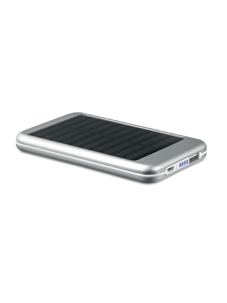 Power bank 4000 mAh z aluminium z recyklingu i panelem ładowania słonecznego. Pojemność dla smartfonów, prąd wyjściowy DC5V/1A. Zawiera lampkę kontrolną i kabel USB z wtyczką micro USB.