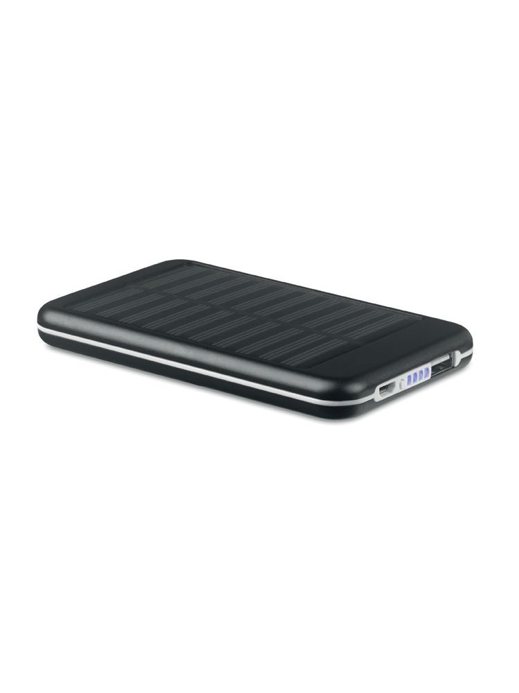 Power bank 4000 mAh z aluminium z recyklingu i panelem ładowania słonecznego. Pojemność dla smartfonów, prąd wyjściowy DC5V/1A. Zawiera lampkę kontrolną i kabel USB z wtyczką micro USB.