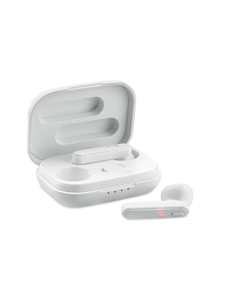 Zestaw 2 słuchawek True Wireless Stereo (TWS) 5.3 z mikrofonem i wbudowanym akumulatorem 30 mAh. Czas odtwarzania ok. 3 godziny. Automatyczne parowanie. W zestawie kabel do ładowania micro USB i stacja ładująca 185 mAh.