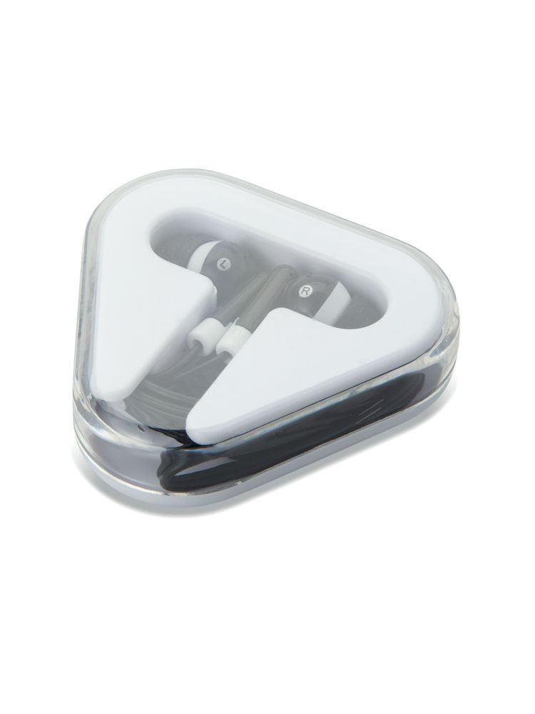 Słuchawki z PVC w trójkątnym etui. Kabel długości 120cm.