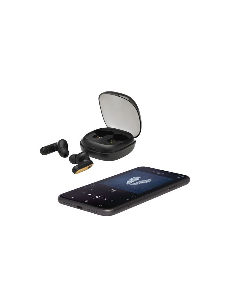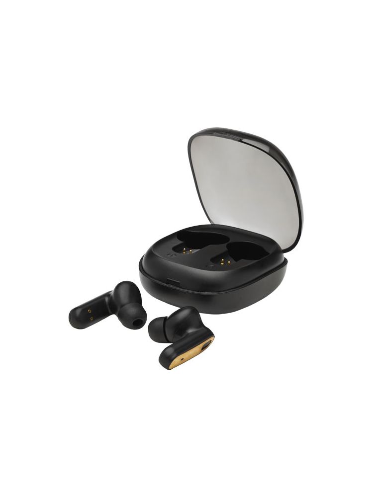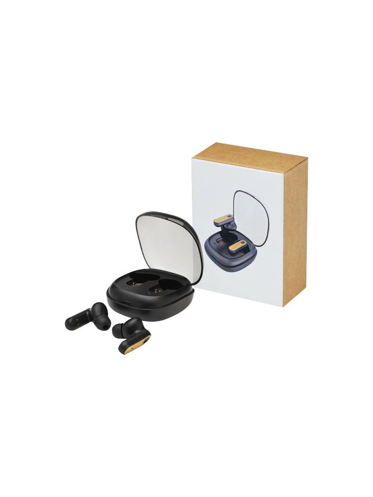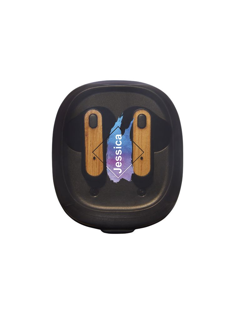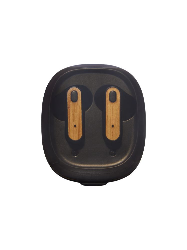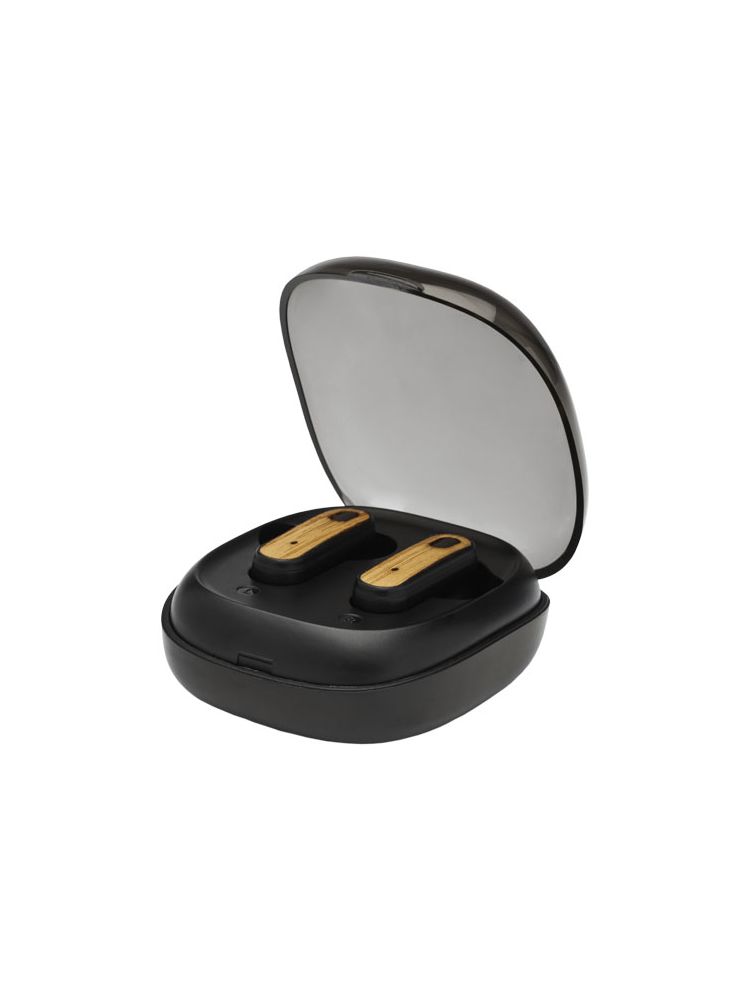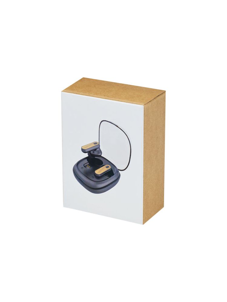 Słuchawki douszne TWS z bambusa z funkcją automatycznego parowania, która ułatwia połączenie z urządzeniem mobilnym. Czas odtwarzania wynosi do 3,5 godziny przy maksymalnej głośności, a słuchawki douszne można w pełni naładować w ciągu 2 godzin. Połączenie w technologii Bluetooth® 5.0 o zasięgu do 10 metrów. Przycisk wielofunkcyjny z opcjami odtwarzania/ pauzy/ kolejnej ścieżki/ poprzedniej ścieżki/ i odbierania/odrzucania połączeń telefonicznych. W zestawie silikonowe końcówki douszne w 3 różnych rozmiarach dla zapewnienia optymalnego komfortu przy użytkowaniu. Dostarczane w pudełku upominkowym wraz z instrukcją obsługi (oba te przedmioty wykonane są z materiałów ekologicznych).