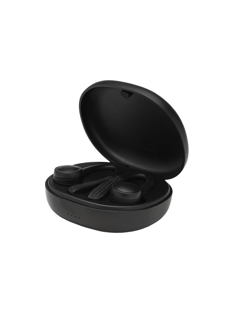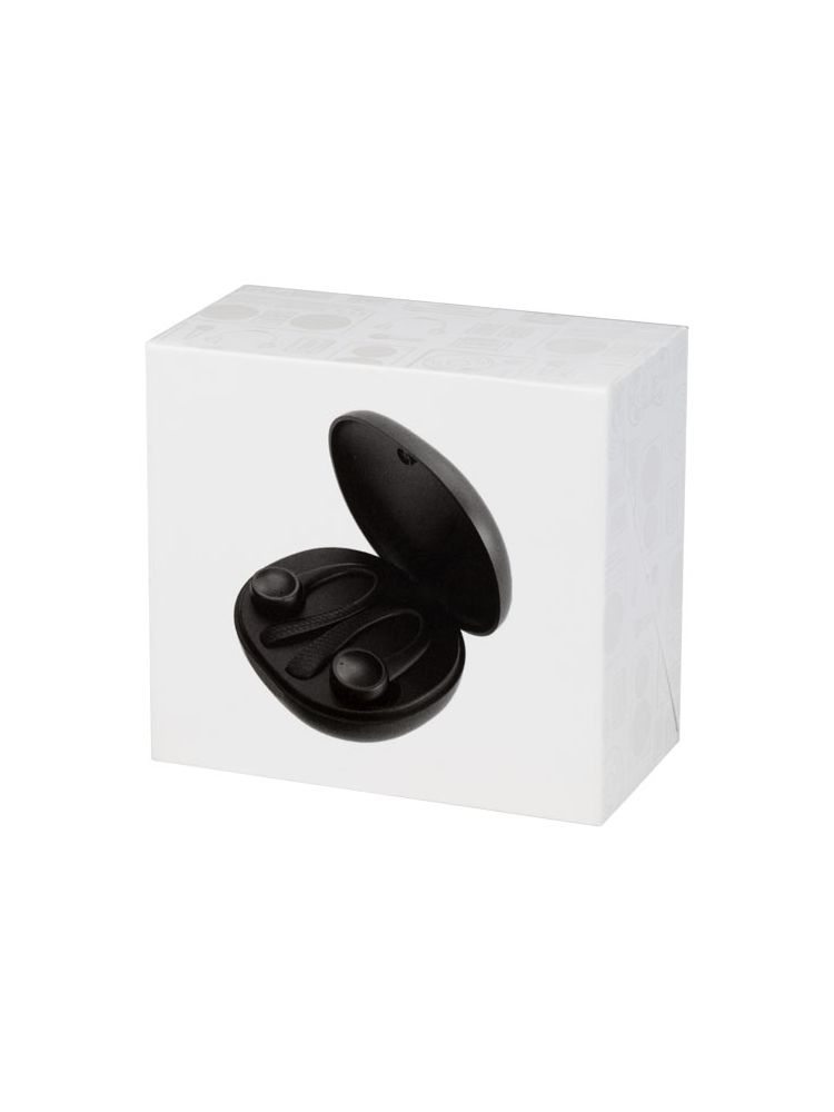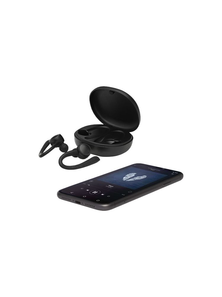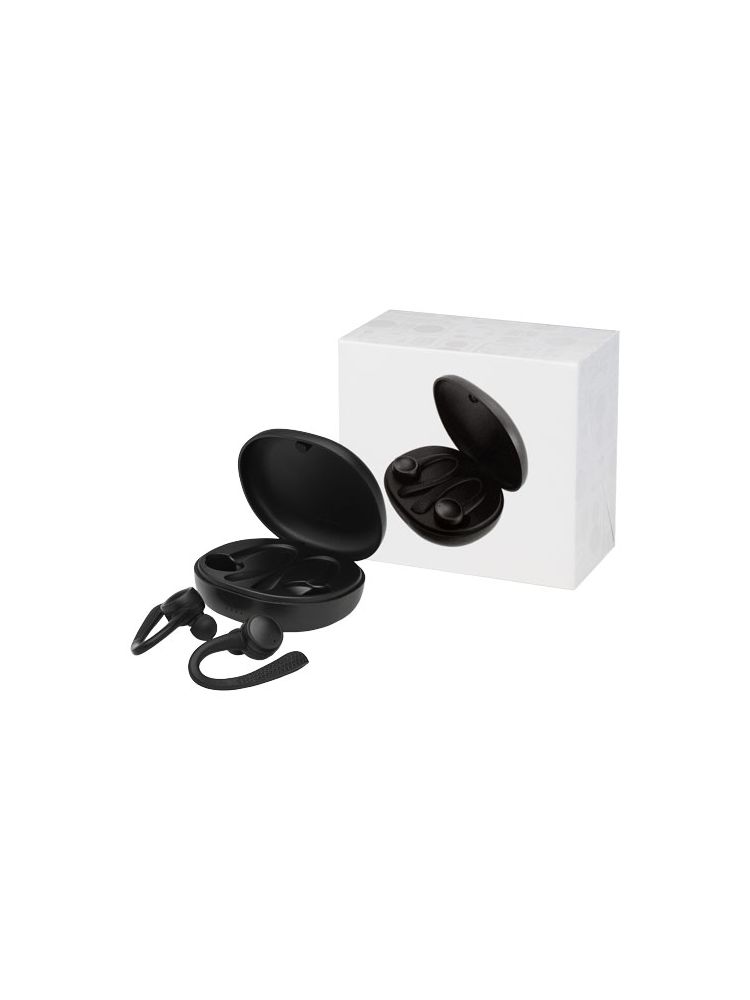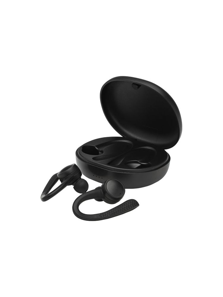 Słuchawki douszne z certyfikatem wodoszczelności IPX 5 z wbudowanym przyciskiem sterującym w obu słuchawkach. Do 6 godziny muzyki przy maksymalnej głośności na jednym ładowaniu. Czas ładowania wynosi około 1,5 godziny. W zestawie z 3 adapterami. Bluetooth 5.0. Sprzedawane w ozdobnym pudełku upominkowym.