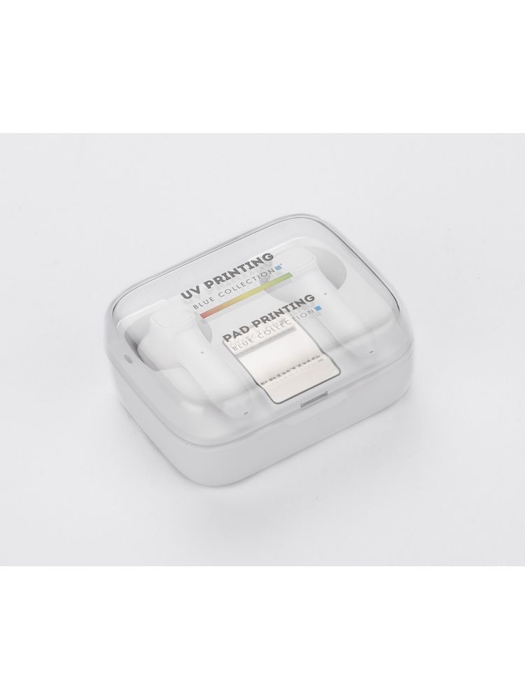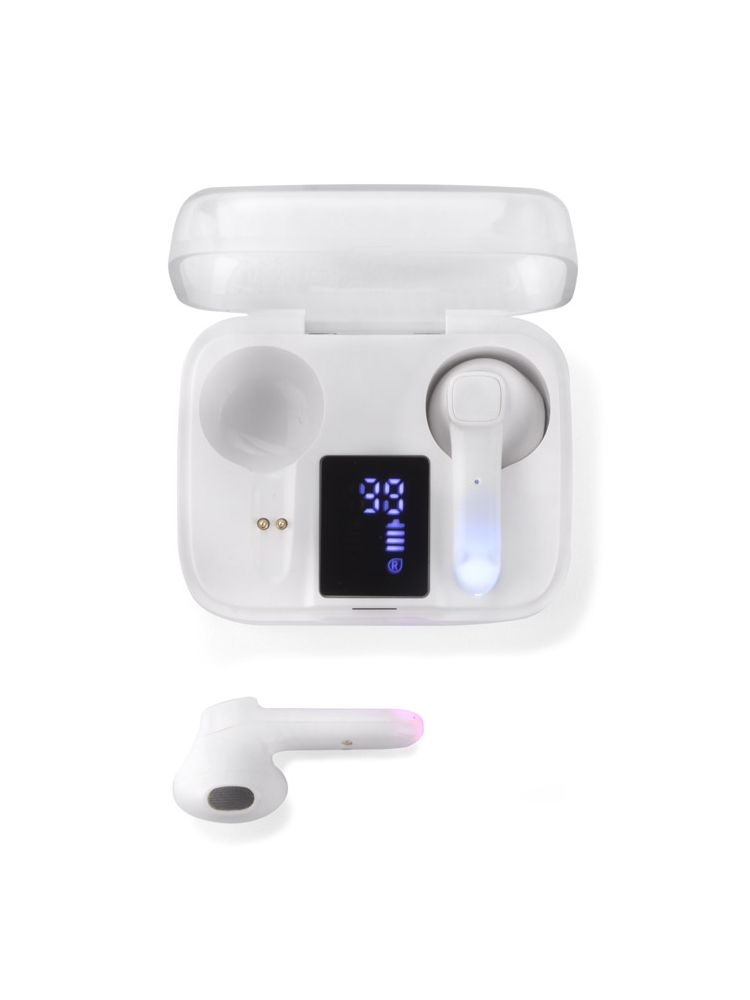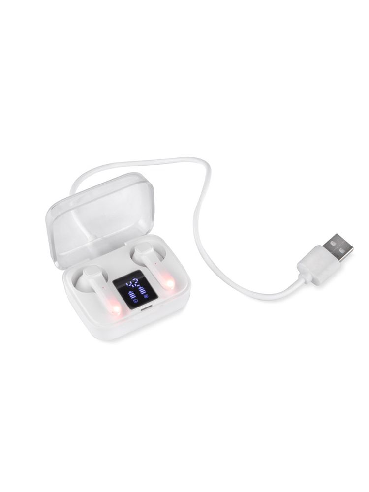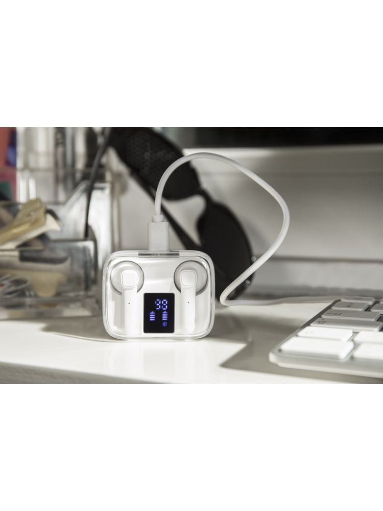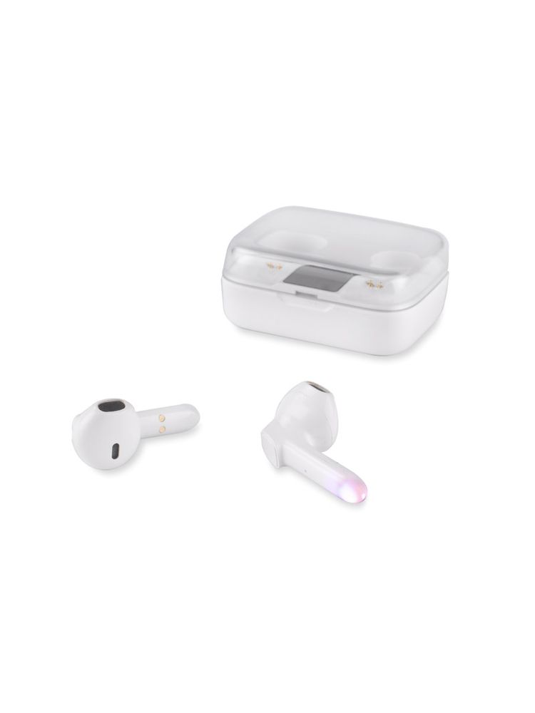 Słuchawki bezprzewodowe TRUVI to kompaktowych rozmiarów słuchawki douszne zapakowane w poręczne etui, które pełni jednocześnie funkcję akumulatora i umożliwia doładowanie urządzenia. Wyświetlacz LED pokazuje aktualny stan naładowania zarówno baterii w etui, a także każdej słuchawki. Dotykowe sterowanie słuchawek zapewnia wygodę użytkowania. Słuchawki posiadają wbudowany mikrofon, co pozwala na prowadzenie rozmów. Możliwość używania tylko jednej słuchawki. Dane techniczne: wersja Bluetooth: V5.1, częstotliwość Bluetooth: 2,4 – 2,48 GHz, zasięg Bluetooth: do 10m, pojemność baterii w każdej słuchawce: 30 mAh, pojemność baterii w etui: 300 mAh, czas pracy do 3 godz., czas czuwania: 300 godz.
