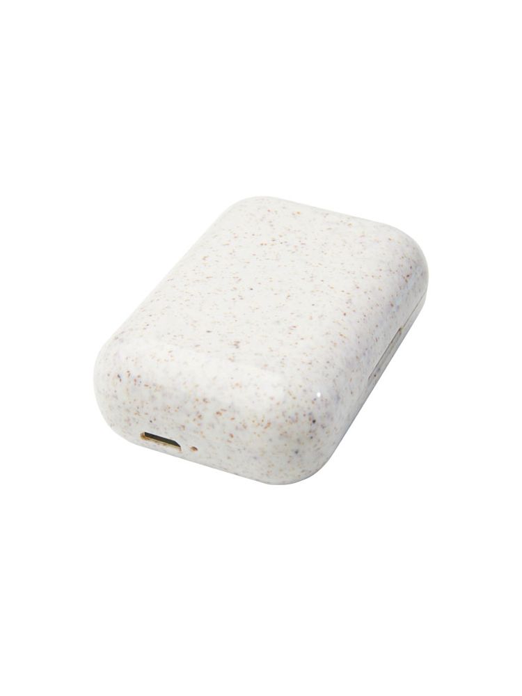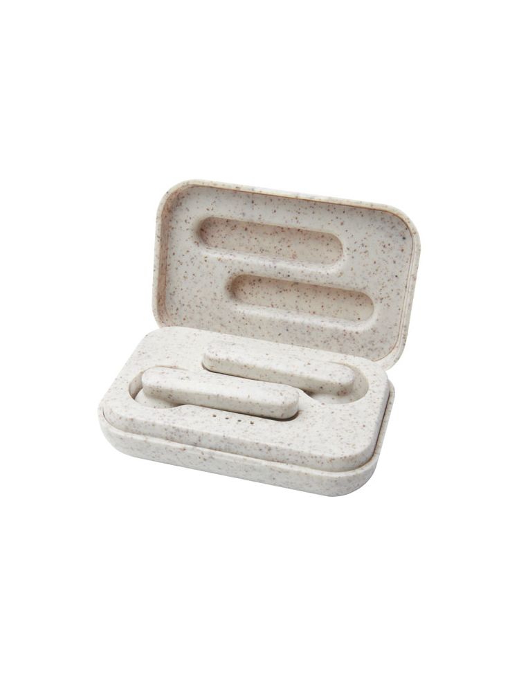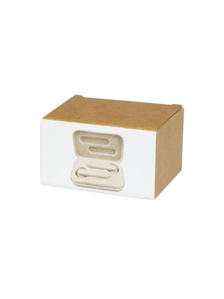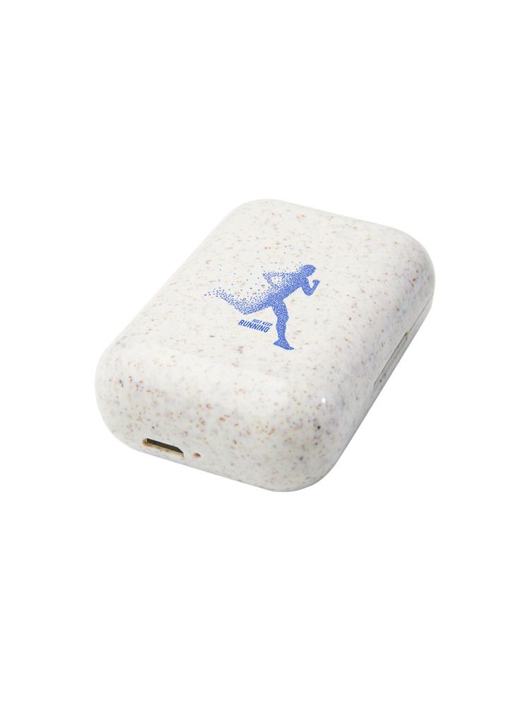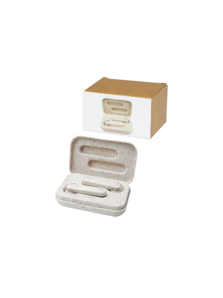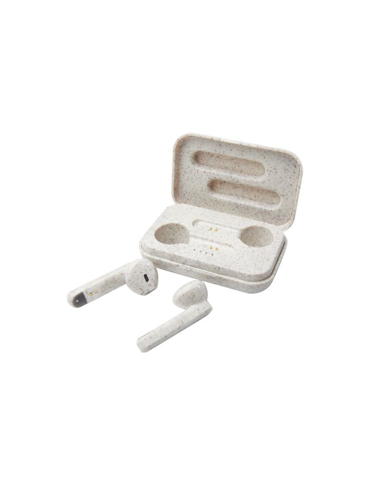 Bezprzewodowe słuchawki douszne True Wireless stereo wykonane z mieszanki plastiku i słomy pszenicznej, co zmniejsza ilość potrzebnego plastiku. Słuchawki douszne z wbudowanym wielofunkcyjnym przyciskiem do sterowania wszystkimi funkcjami: Włączanie/wyłączanie, odbieranie/rozłączanie, odtwarzanie, pauza, następny/poprzedni utwór, zwiększanie/zmniejszanie głośności, aktywacja asystenta głosowego. Połączenie w technologii Bluetooth® 5.0 o zasięgu do 10 metrów. Kapsuła zasilająca może naładować słuchawki od 0 do 100% co najmniej 3 razy. Czas odtwarzania wynosi do 2 godzin przy maksymalnej głośności, a pełne naładowanie słuchawek trwa 1 godzinę. Dostarczane w pudełku upominkowym wraz z instrukcją obsługi (oba te przedmioty wykonane są z materiałów ekologicznych).