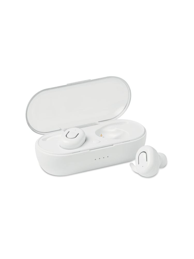 Zestaw 2 bezprzewodowych słuchawek dousznych TWS 5.0 z mikrofonem i wbudowanym akumulatorem 45 mAh. Czas odtwarzania ok. 3 godziny. Automatyczne parowanie. W komplecie kabel do ładowania micro USB. Prezentowane w pudełku, które pełni również funkcję stacji ładującej z akumulatorem Li-ion 250 mAh.