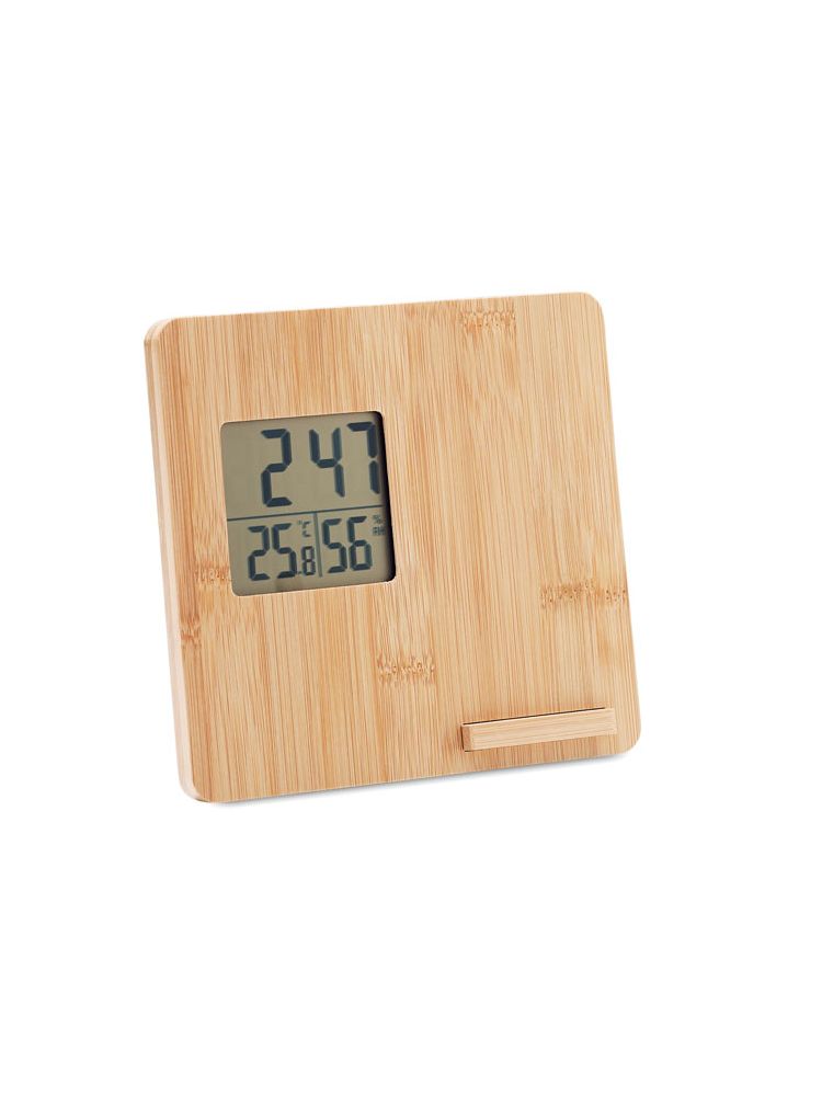 Bezprzewodowa ładowarka 15 W z wyświetlaczem czasu, temperatury i wilgotności oraz funkcją podstawki na smartfon w bambusowej obudowie. W zestawie 1 bateria CR2032. Wyjście bezprzewodowe: DC 9V/1.15A (15W) do szybkiego ładowania.