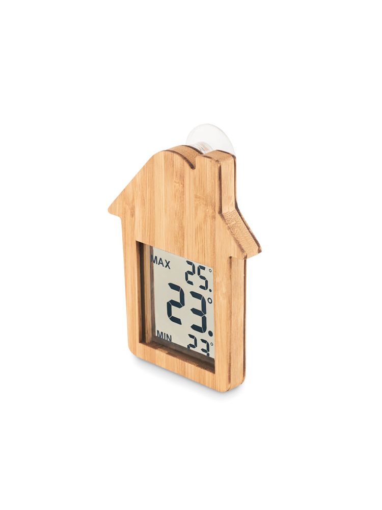 Bambusowa stacja pogodowa w kształcie domu z przyssawką z tyłu. Dołączona 1 bateria LR44. Bambus jest produktem naturalnym, dlatego mogą wystąpić nieznaczne różnice w kolorze, wzorze i rozmiarze.