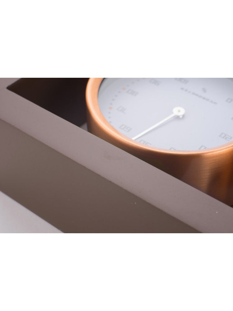 Zegar z funkcją budzika, termometr i higrometr przymocowane do drewnianej obudowy. Wymaga baterii: AA x 1 szt. Bateria nie dołączona.