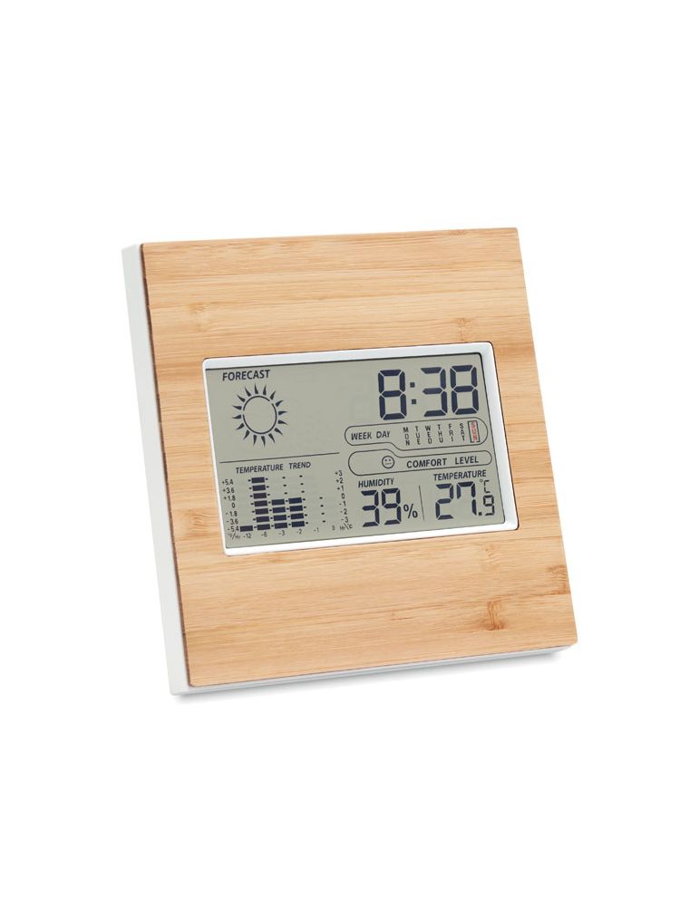 Bambusowy termometr wielofunkcyjny. Zawiera zegar, wyświetlacz temperatury, wilgotności i kalendarz. 2 baterie AAA nie wchodzą w skład zestawu. Bambus jest produktem naturalnym, dlatego mogą występować niewielkie różnice w kolorze i rozmiarze poszczególnych elementów, co może mieć wpływ na ostateczny efekt zdobienia.
