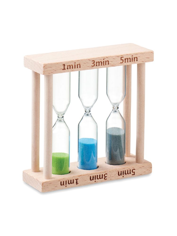 Drewniany potrójny zegar piaskowy z 3 różnymi klepsydrami (ok. 1, 3 i 5 minuty).