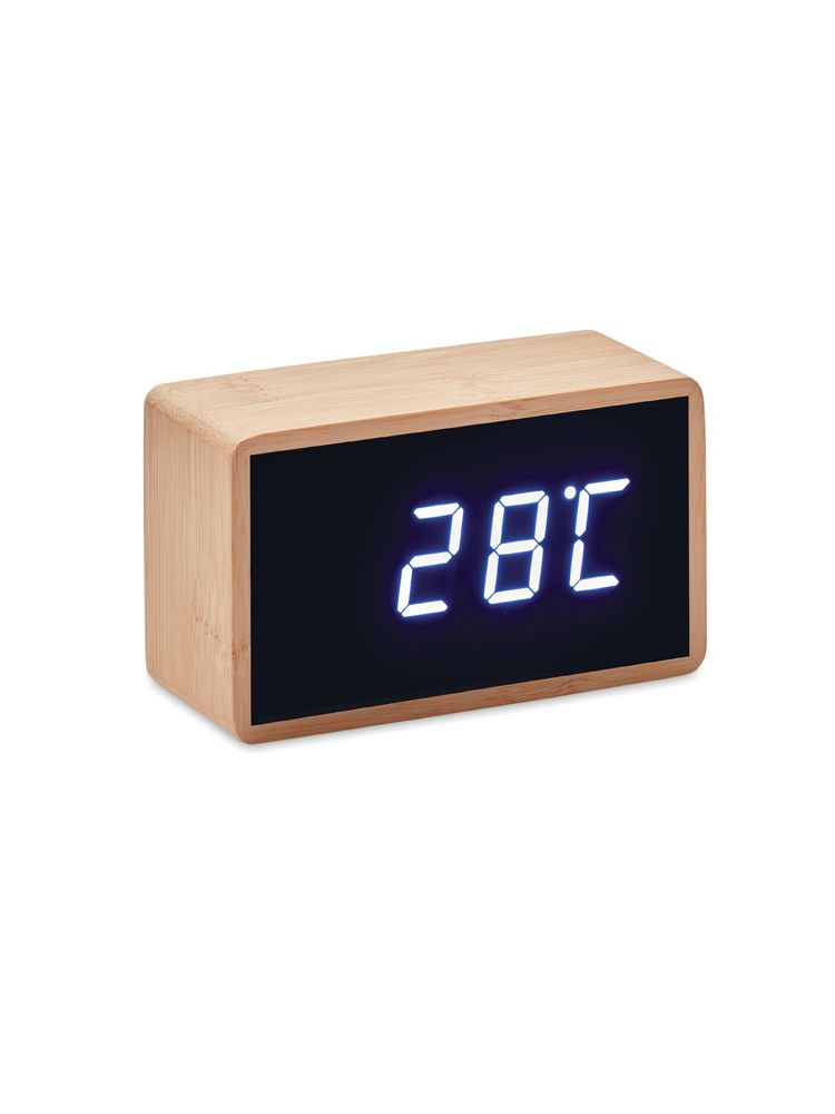 Wyświetlacz LED z budzikiem i wskaźnikiem temperatury w bambusowej obudowie. W zestawie adapter AC-DC. Bambus jest produktem naturalnym, mogą występować niewielkie różnice w kolorze i rozmiarze.