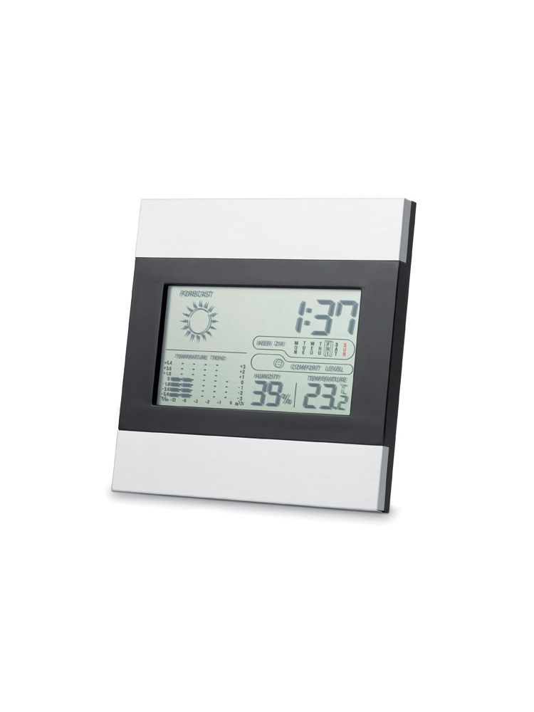 Stylowa srebrno-czarna stacja pogodowa, z zegarem, kalendarzem, wskaźnikiem temperatury i poziomu wilgotności. 2 baterie AAA nie dołączone.