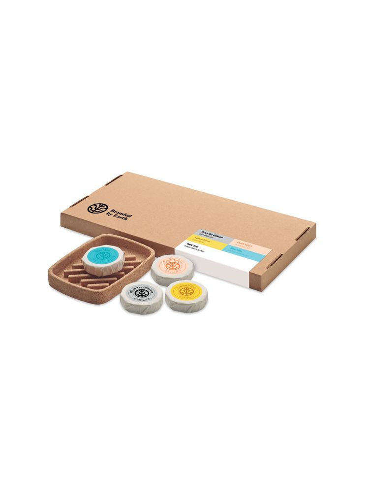 Zestaw upominkowy unisex marki Branded by Earth. Zawiera cztery 50gr wegańskie kostki: do mycia ciała, do mycia włosów, do pilingu twarzy oraz wodę micelarną również w kostce, a także korkową podstawkę pod mydełka. Każda kostka zapakowana w papier. Całość w pudełku z papieru z recyklingu. Wyprodukowano w UE Korek jest materiałem w 100% naturalnym. Ze względu na jego strukturę i porowatość powierzchni ostateczny wygląd nadruku na każdym artykule może się różnić.