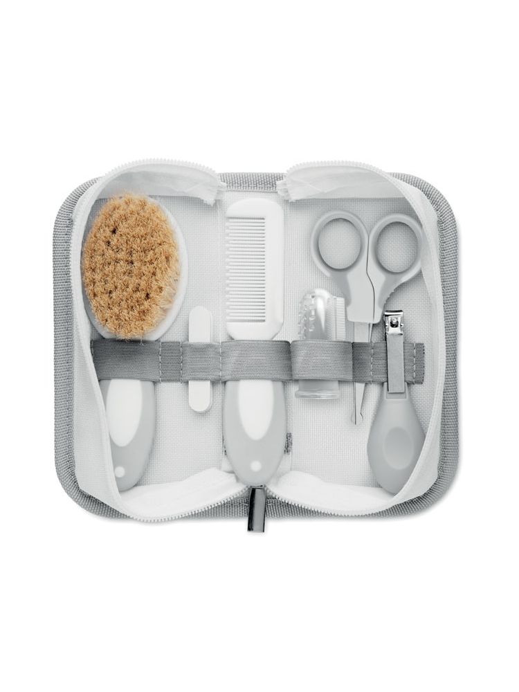 6-częściowy zestaw do pielęgnacji niemowląt. Zawiera: delikatną szczotkę do pielęgnacji, grzebień dla niemowląt, szczoteczkę do zębów, pilnik do paznokci, obcinacz do paznokci i nożyczki. Zapakowany w torbę z poliestru 600D.