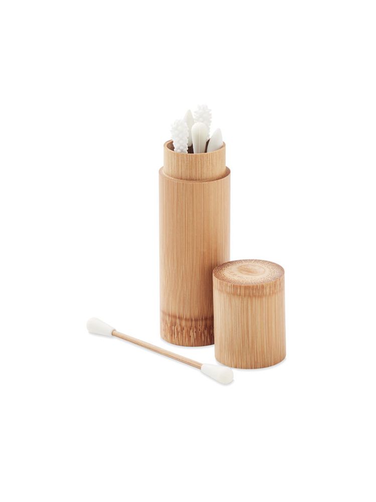 6 silikonowych, podwójnych patyczków wielokrotnego użytku do pielęgnacji wykonanych z bambusa, w bambusowym pudełku. Bambus jest produktem naturalnym, dlatego mogą wystąpić nieznaczne różnice w kolorze, wzorze i rozmiarze.