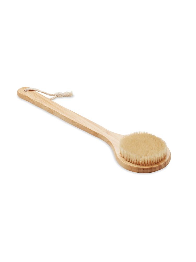 Bambusowa szczotka do kąpieli z jutowym sznurkiem i nylonowym włosiem. Bambus jest produktem naturalnym, dlatego mogą wystąpić nieznaczne różnice w kolorze, wzorze i rozmiarze.