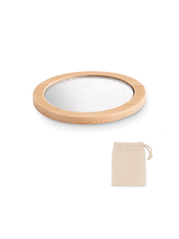 Okrągłe bambusowe jednostronne lusterko do makijażu. To małe lusterko jest idealnym niezbędnikiem, kiedy chcesz wykonać makijaż lub szybko sprawdzić, jak wyglądasz. Zapakowane jest w bawełniane etui z sznurkiem. Bambus jest produktem naturalnym, mogą wystąpić niewielkie różnice w kolorze i wielkości poszczególnych elementów, co może mieć wpływ na końcowy efekt dekoracji. FSC®-certified | FSC 100%, N5.7, FSC-C213206