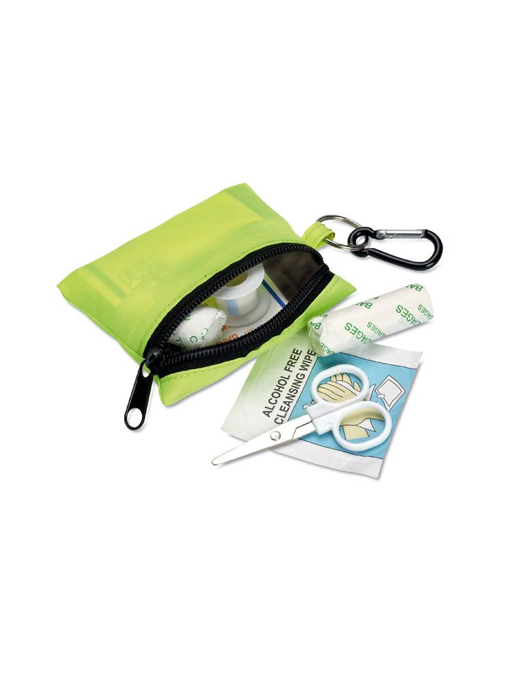 Zestaw pierwszej pomocy w etui z polyestru, z karabinkiem. W komplecie nożyczki, mokre chusteczki, bandaż gazowy, 3 bawełniane patyczki z wacikami i 5 samoprzylepnych plastrów.