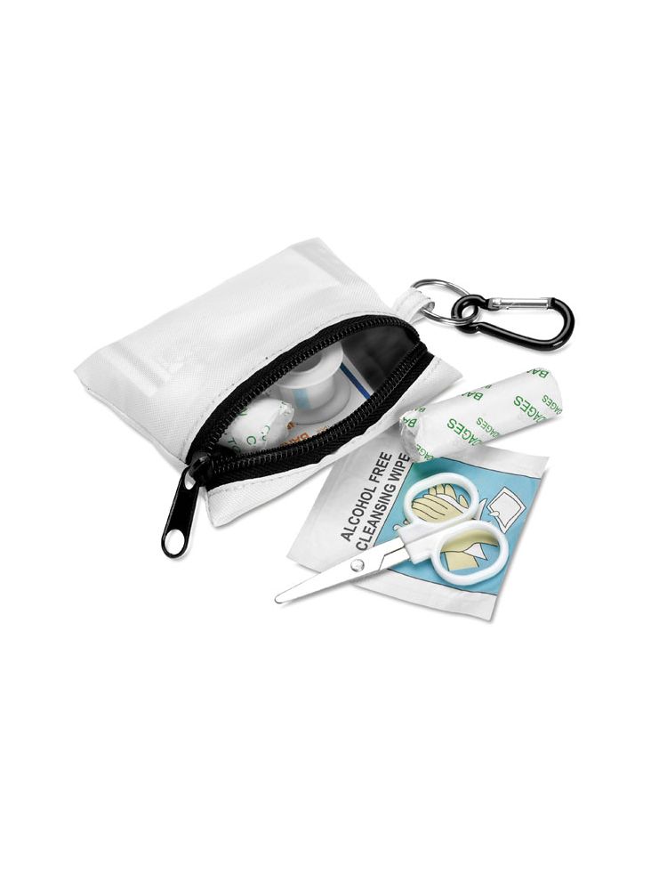 Zestaw pierwszej pomocy w etui z polyestru, z karabinkiem. W komplecie nożyczki, mokre chusteczki, bandaż gazowy, 3 bawełniane patyczki z wacikami i 5 samoprzylepnych plastrów.