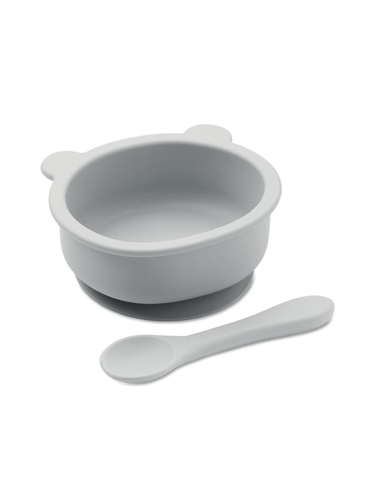 Silikonowy zestaw dla niemowląt. Zawiera łyżeczkę i miseczkę z przyssawką na spodzie.