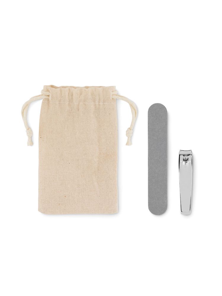 Zestaw do manicure w bawełnianym woreczku na sznurek. Zawiera pilnik do paznokci i obcinacz do paznokci.