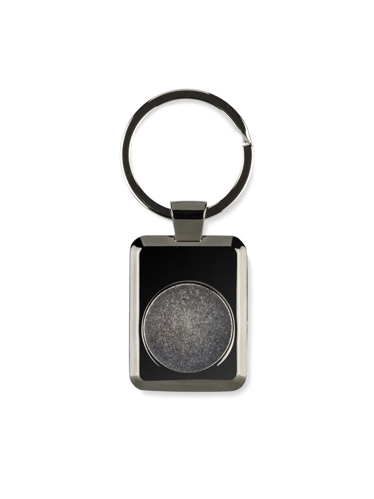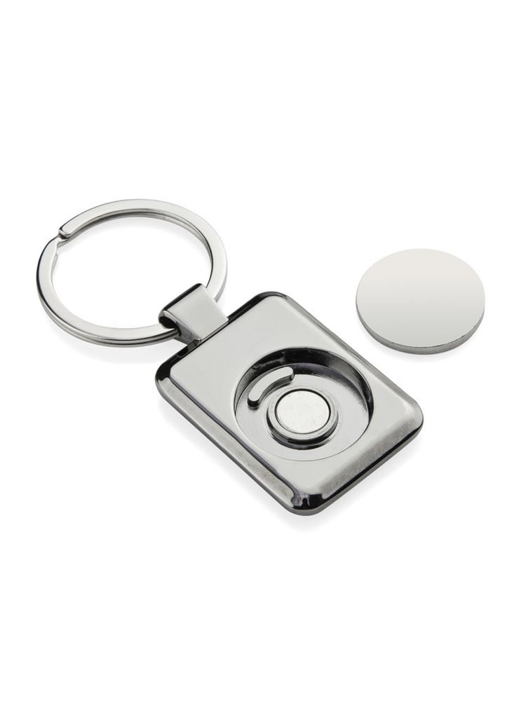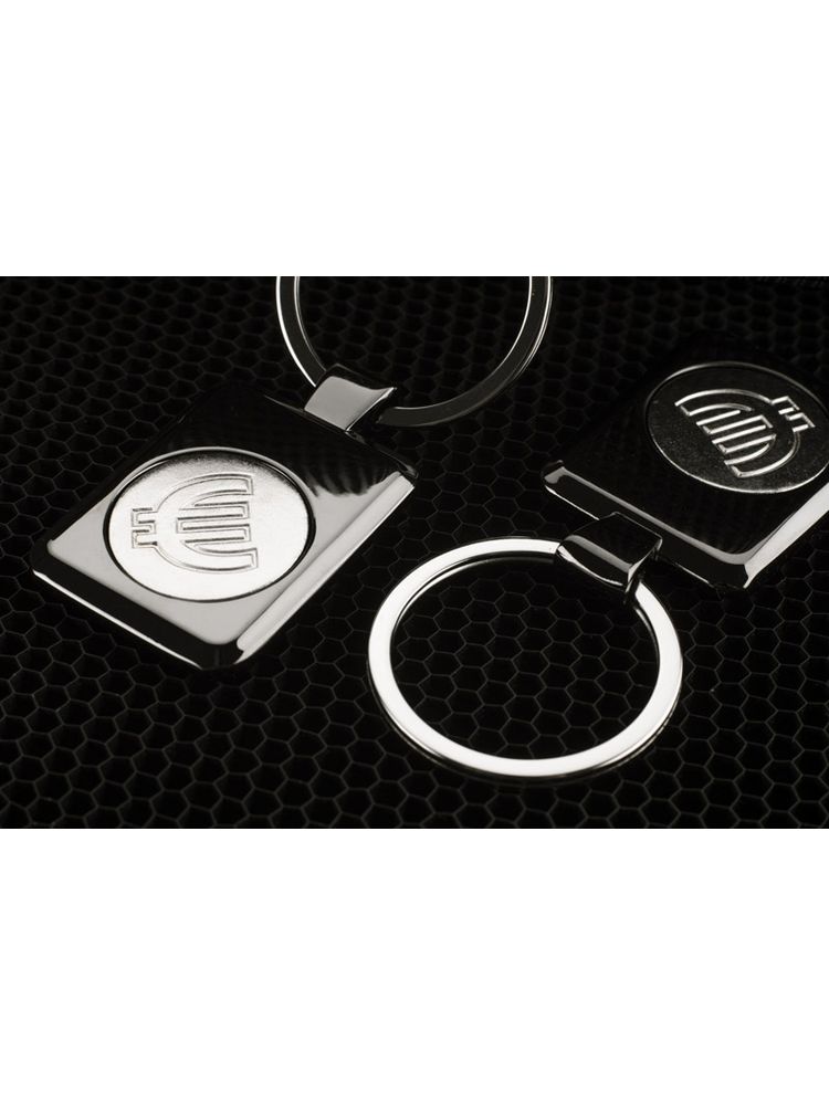 Metalowy brelok z żetonem o błyszczącej powierzchni. Na żetonie umieszczony został symbol Euro. Żeton umieszczony wewnątrz breloka na magnesie, aby go wyjąć wystarczy nasisnąć dolną część żetonu.