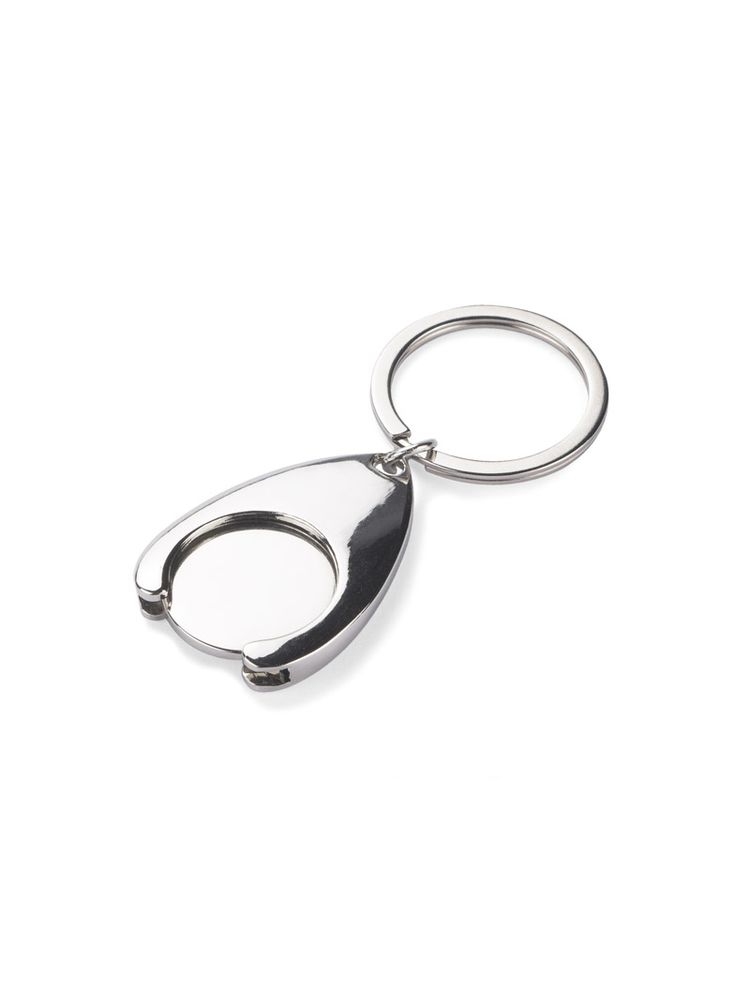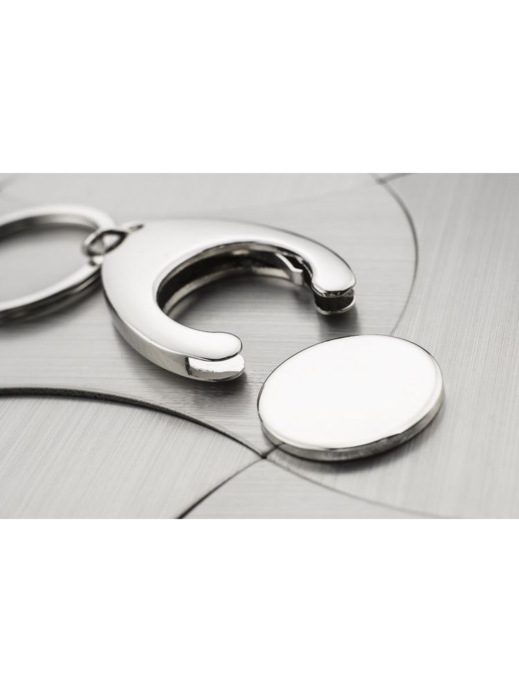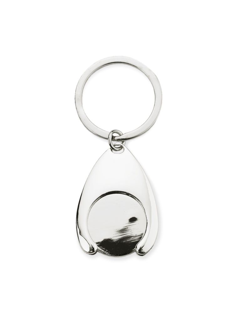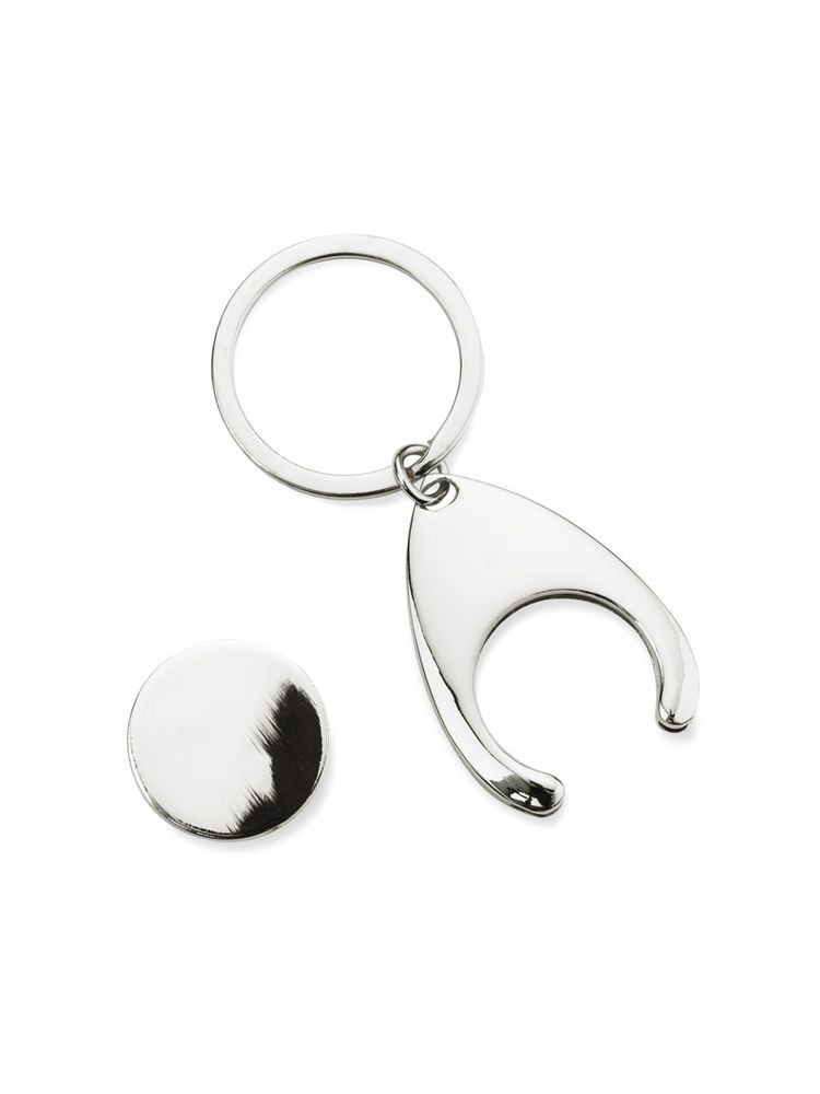 Brelok metalowy na żeton wraz z żetonem, o chromowanej powierzchni. Brelok niezwykle przydatny – przytrzymuje żeton, który pasuje do wózków sklepowych. Pakowany w brązową kopertę. Grawer wykonujemy na żetonie. Żeton jest wielkości 1 Euro.