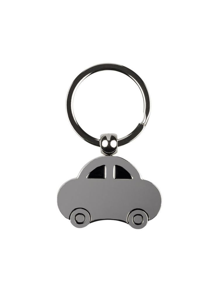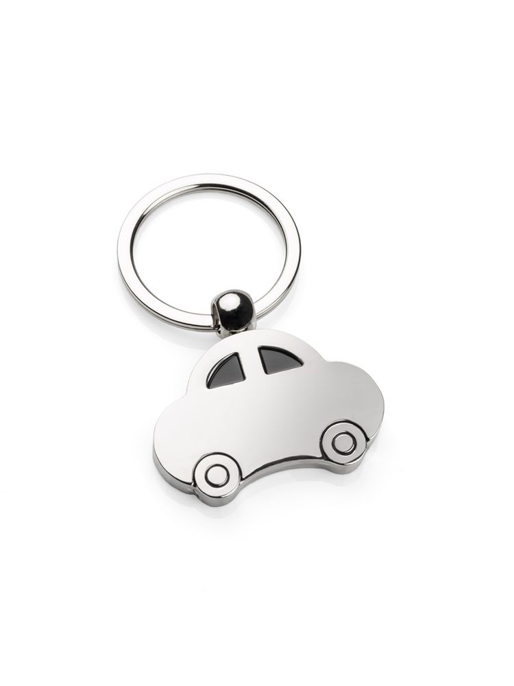 Brelok do kluczy z zawieszką w kształcie samochodu, wykonany z chromowanego metalu. Brelok dwustronny.