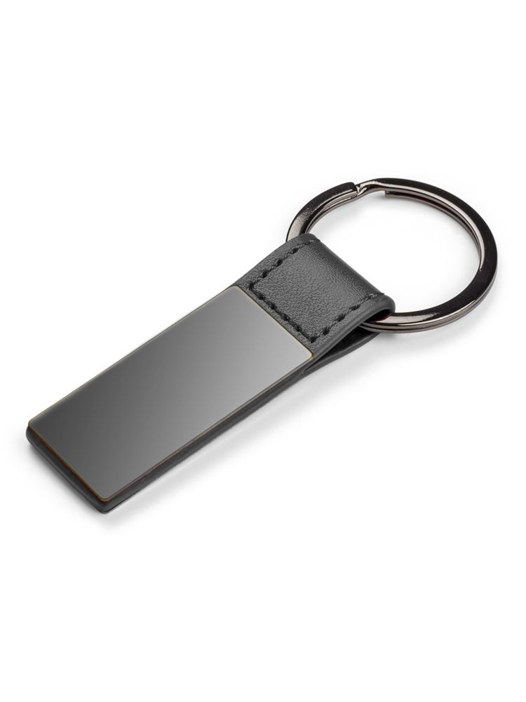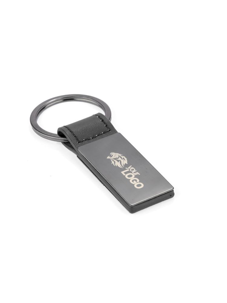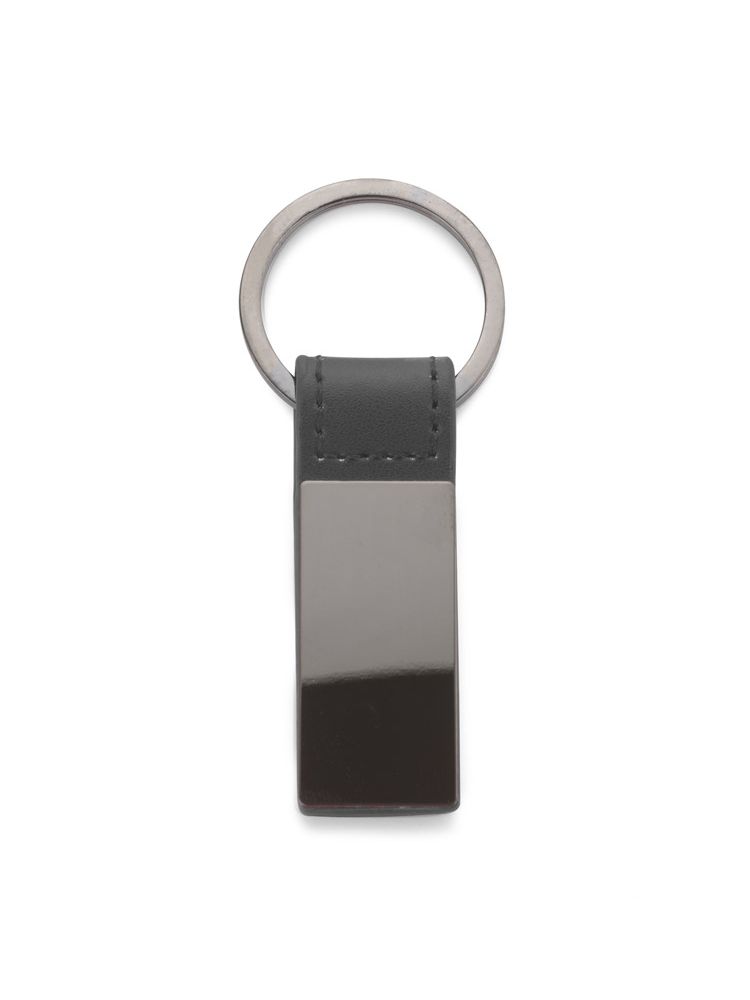 Elegancki dwustronny brelok wykonany z ekoskórki PU i metalu w kolorze grafitowym. Logo wygrawerujemy na metalowej blaszce.