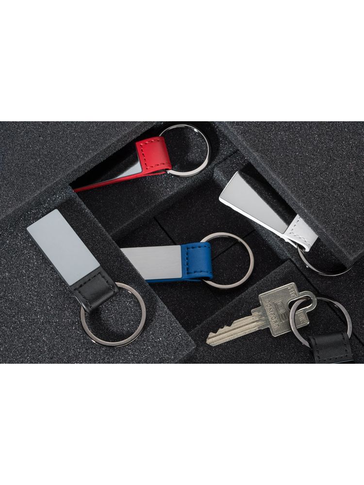 Elegancki dwustronny brelok wykonany z ekoskórki PU i metalu w kolorze grafitowym. Logo wygrawerujemy na metalowej blaszce.