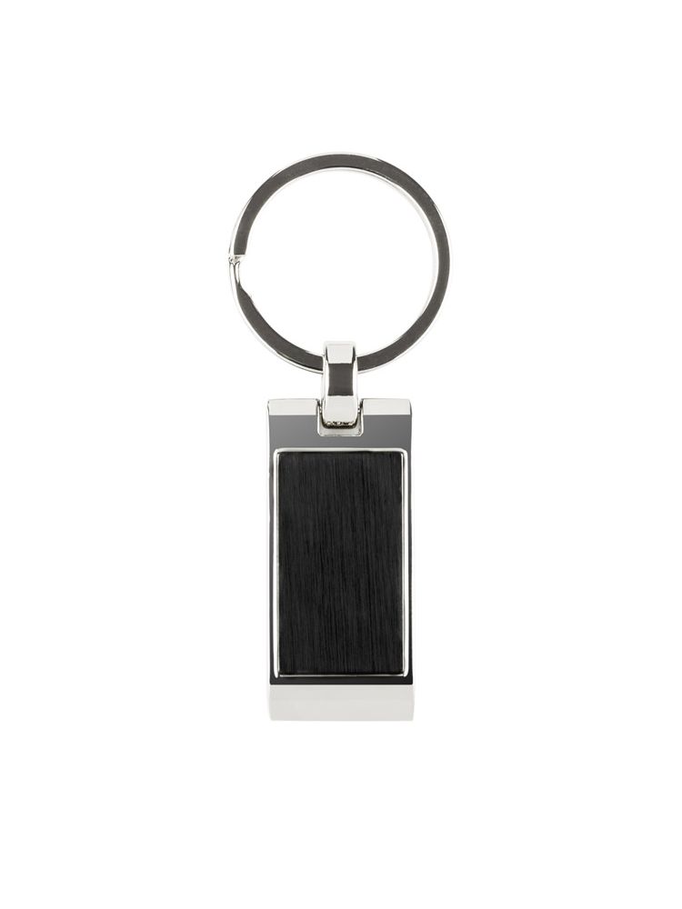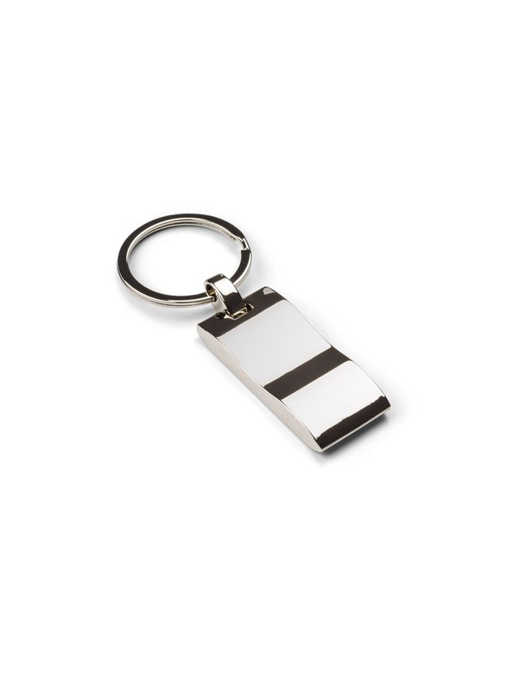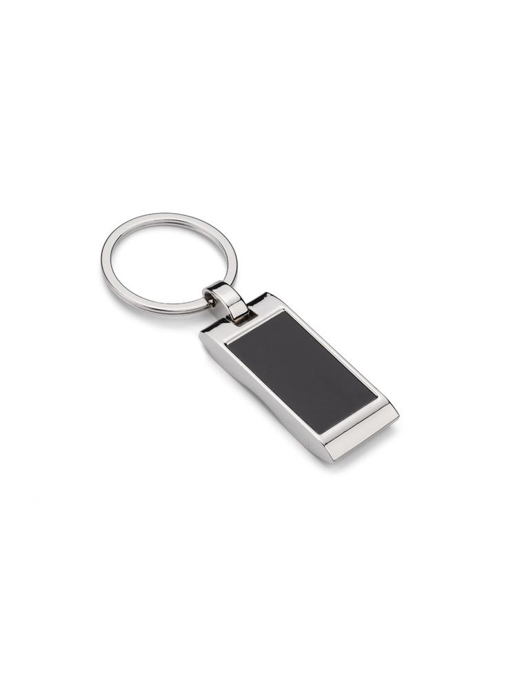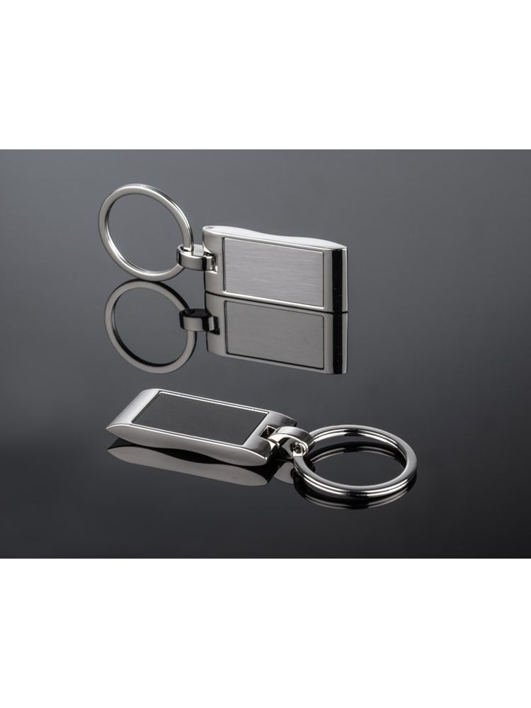 Metalowy brelok do kluczy z prostokątną, falowaną zawieszką. Logo grawerujemy na powierzchni breloka.