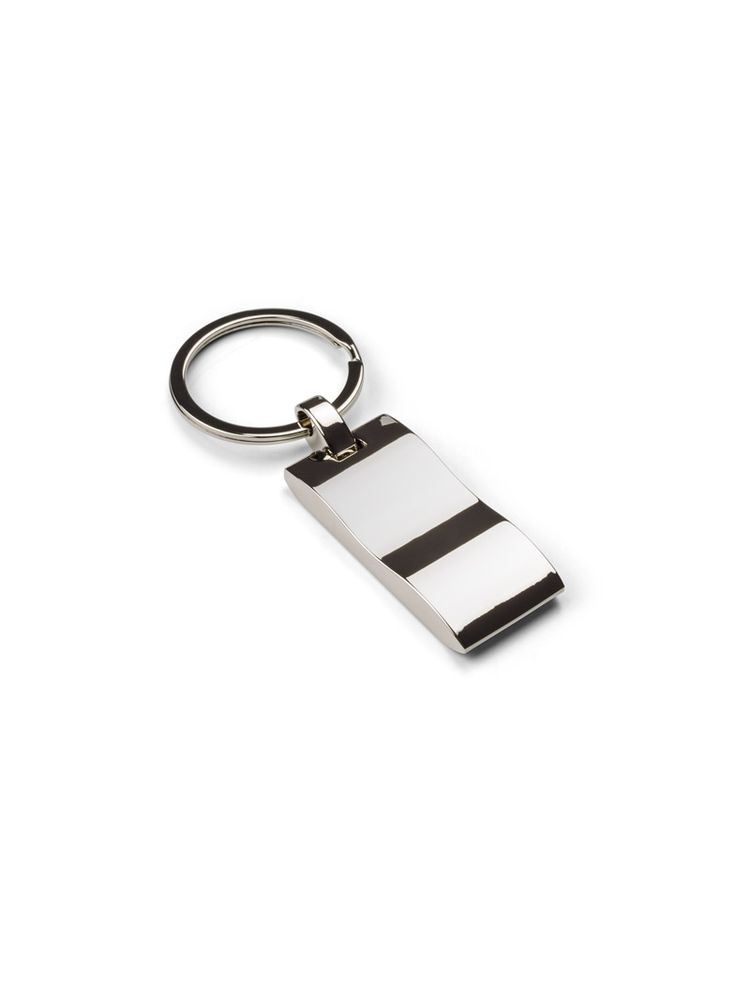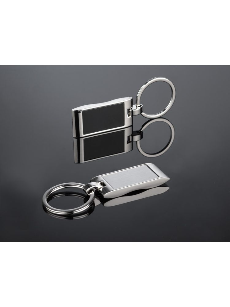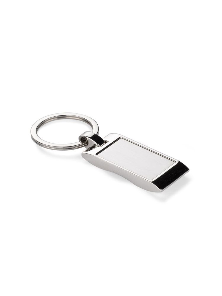 Metalowy brelok do kluczy z prostokątną, falowaną zawieszką. Logo grawerujemy na powierzchni breloka.