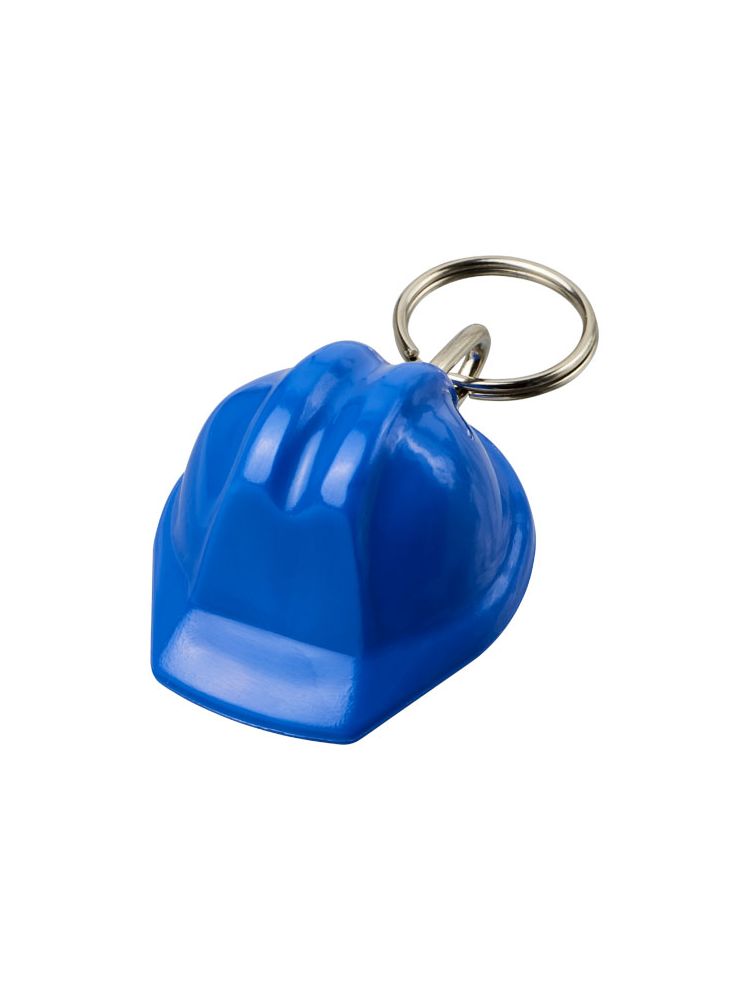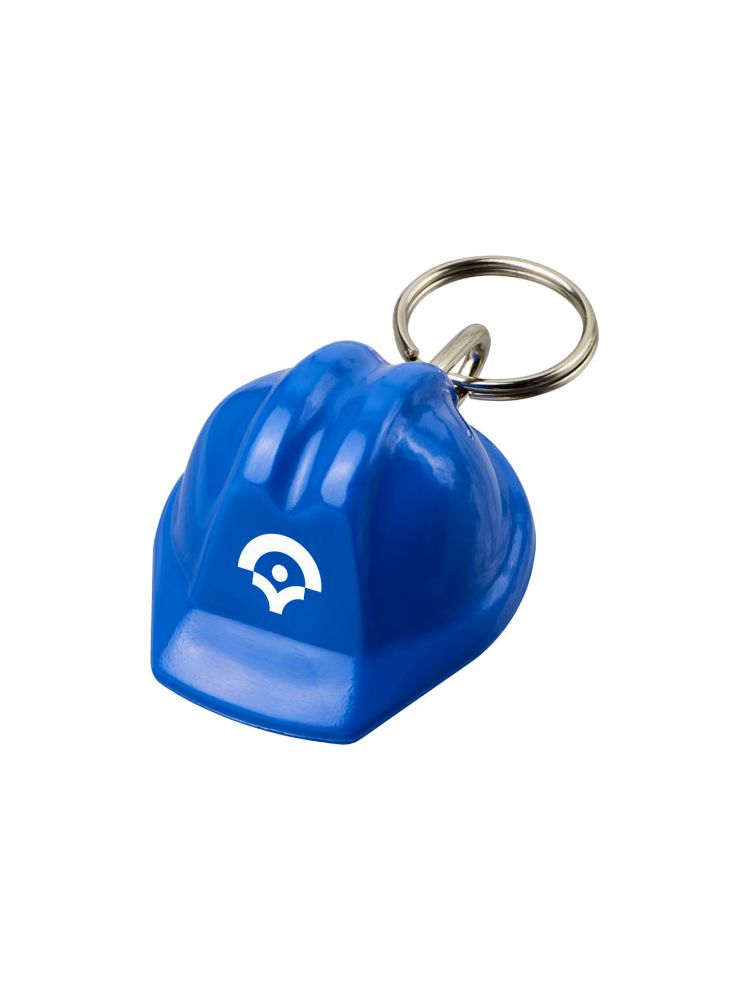 Breloczek w kształcie kasku z metalowym pękiem na klucze. Idealny dla firm budowlanych lub organizacji zajmujących się bezpieczeństwem.