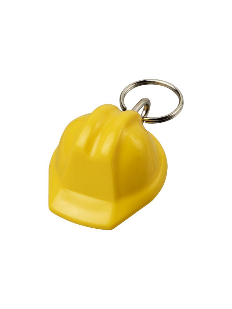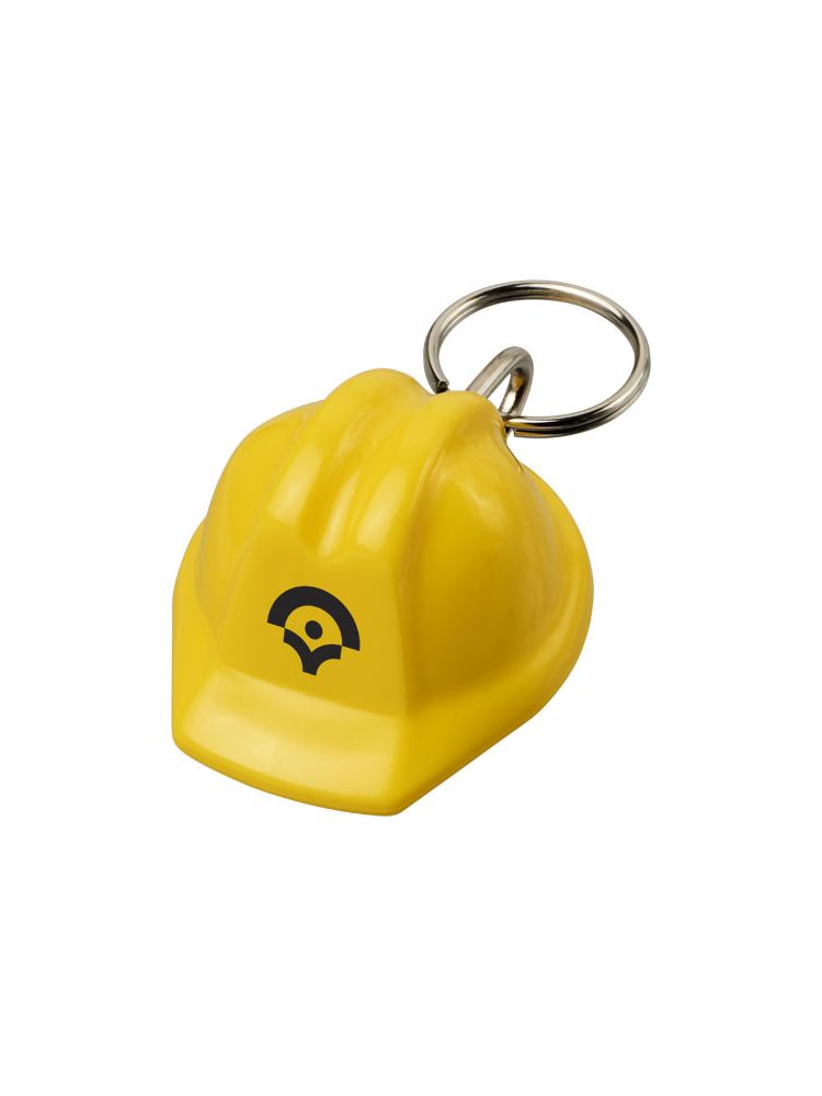 Breloczek w kształcie kasku z metalowym pękiem na klucze. Idealny dla firm budowlanych lub organizacji zajmujących się bezpieczeństwem.