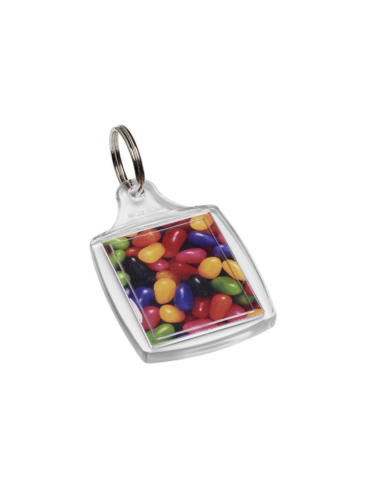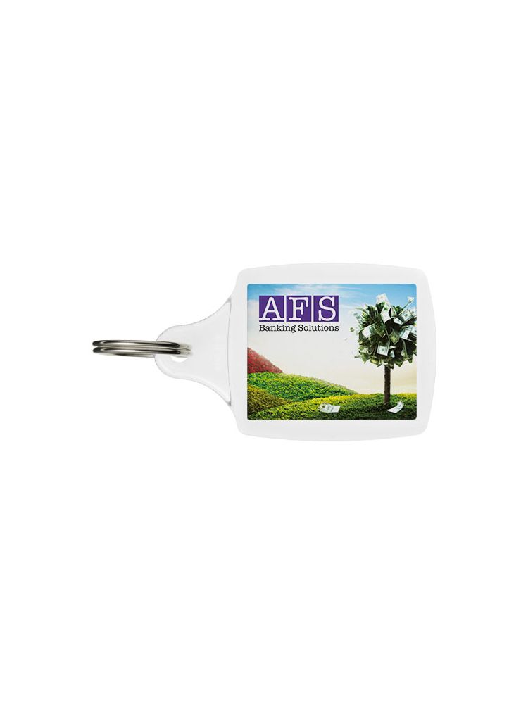 Breloczek S5 z metalowym pękiem na klucze. Wymiary wkładu do druku: 4,0 cm x 3,2 cm.