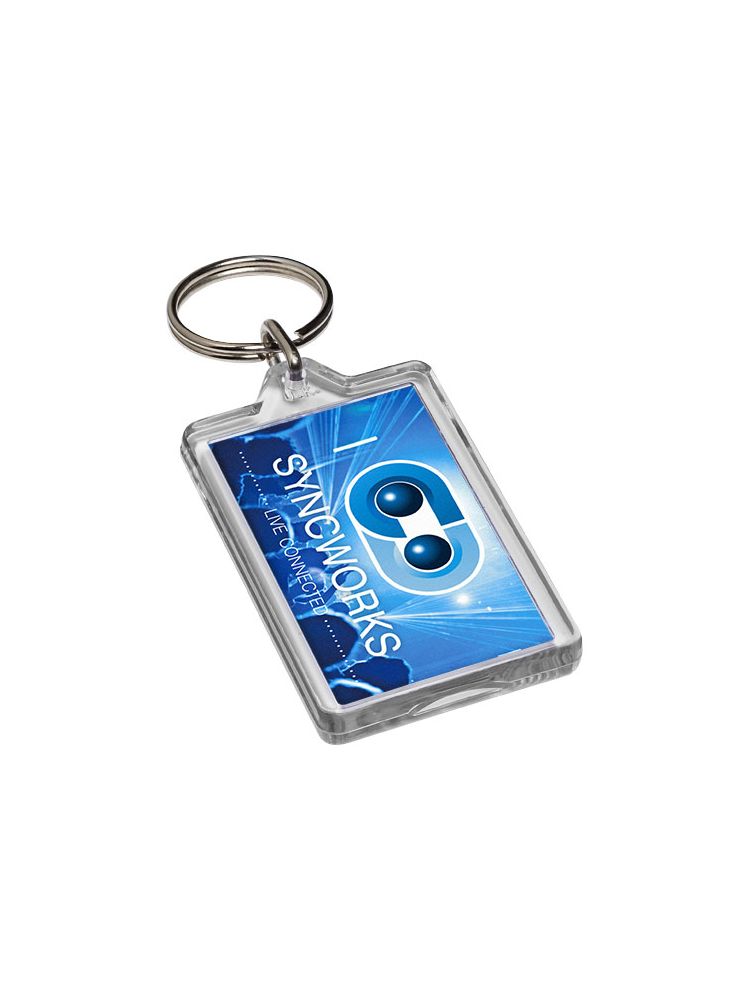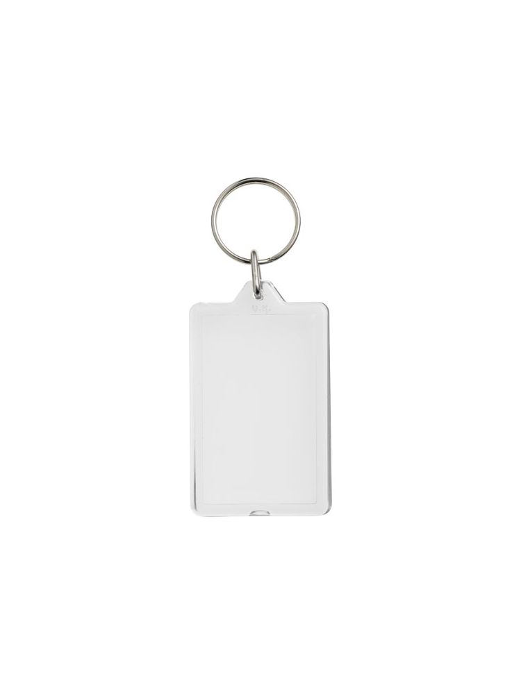 Prostokątny breloczek G1 z metalowym pękiem na klucze. Ten brelok można otwierać za pomocą monety. Metalowy pierścień cechuje płaski profil, który idealnie nadaje się do wysyłek. Wymiary wkładu do druku: 5,0 cm x 3,0 cm.