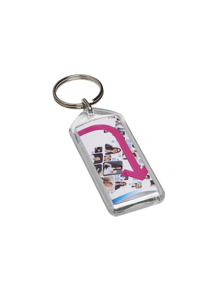 Prostokątny breloczek F1 z metalowym pękiem na klucze. Ten brelok można otwierać za pomocą monety. Metalowy pierścień cechuje płaski profil, który idealnie nadaje się do wysyłek. Wymiary wkładu do druku: 5,0 cm x 2,0 cm.