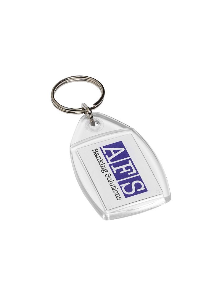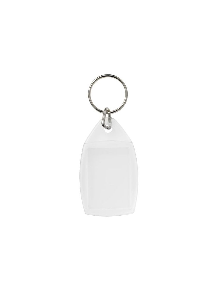Breloczek z metalowym pękiem na klucze. Metalowy pierścień cechuje płaski profil, który idealnie nadaje się do wysyłek. Wymiary wkładu do druku: 3,5 cm x 2,4 cm.