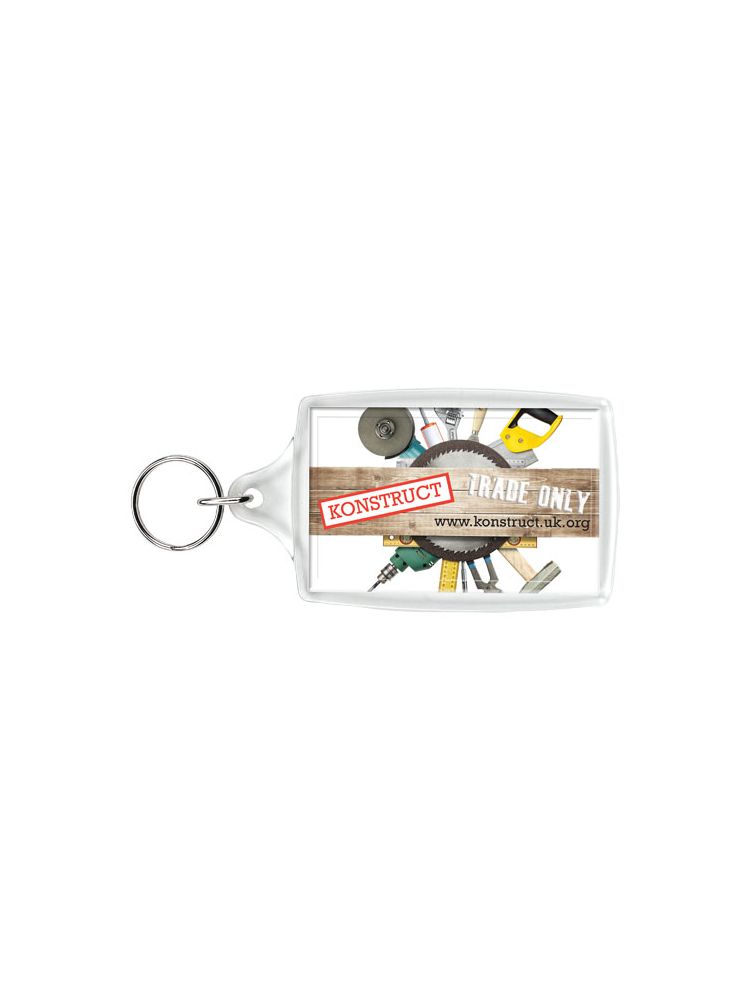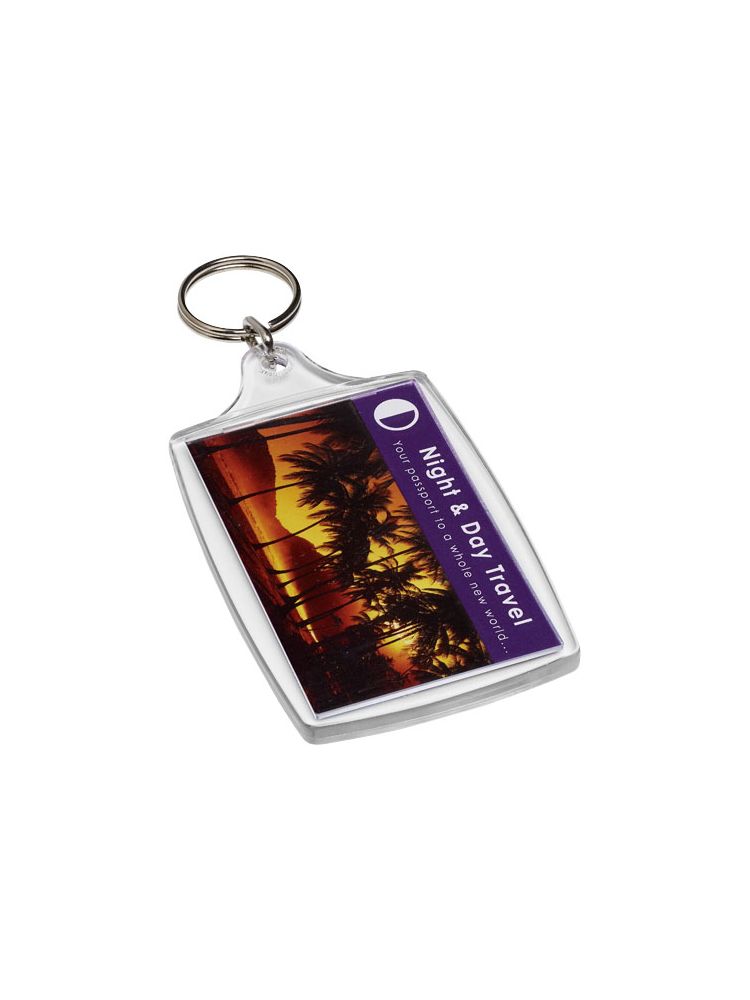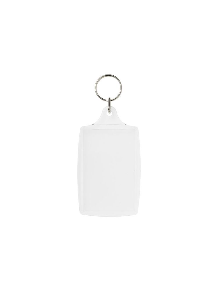Breloczek L4 z metalowym pękiem na klucze. Metalowy pierścień cechuje płaski profil, który idealnie nadaje się do wysyłek. Wymiary wkładu do druku: 7 cm x 4,5 cm.