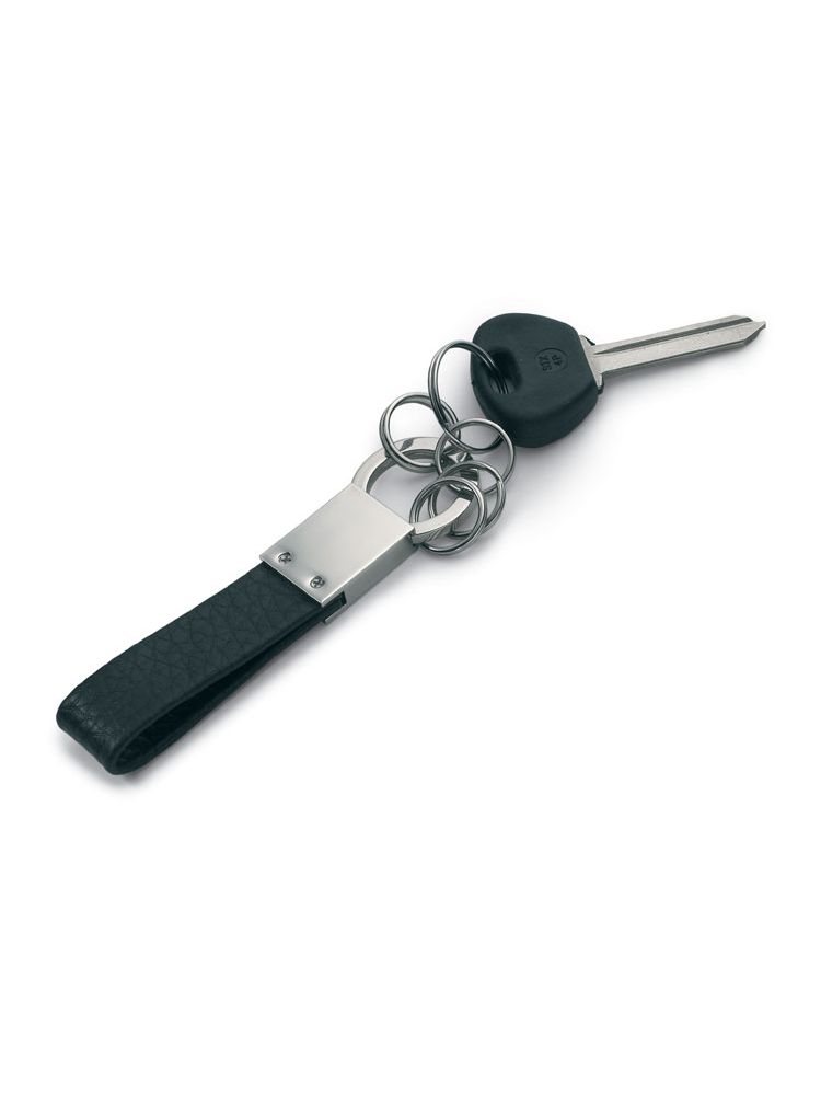 Brelok z wieloma kółkami i paskiem z PU. Błyszczące niklowane wykończenie.