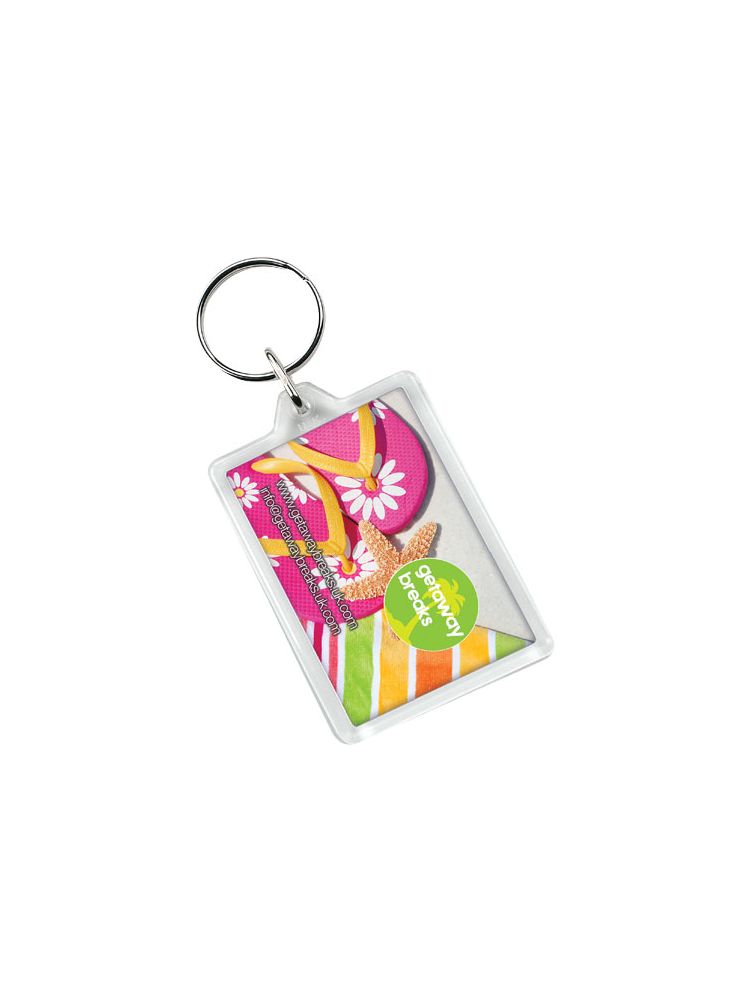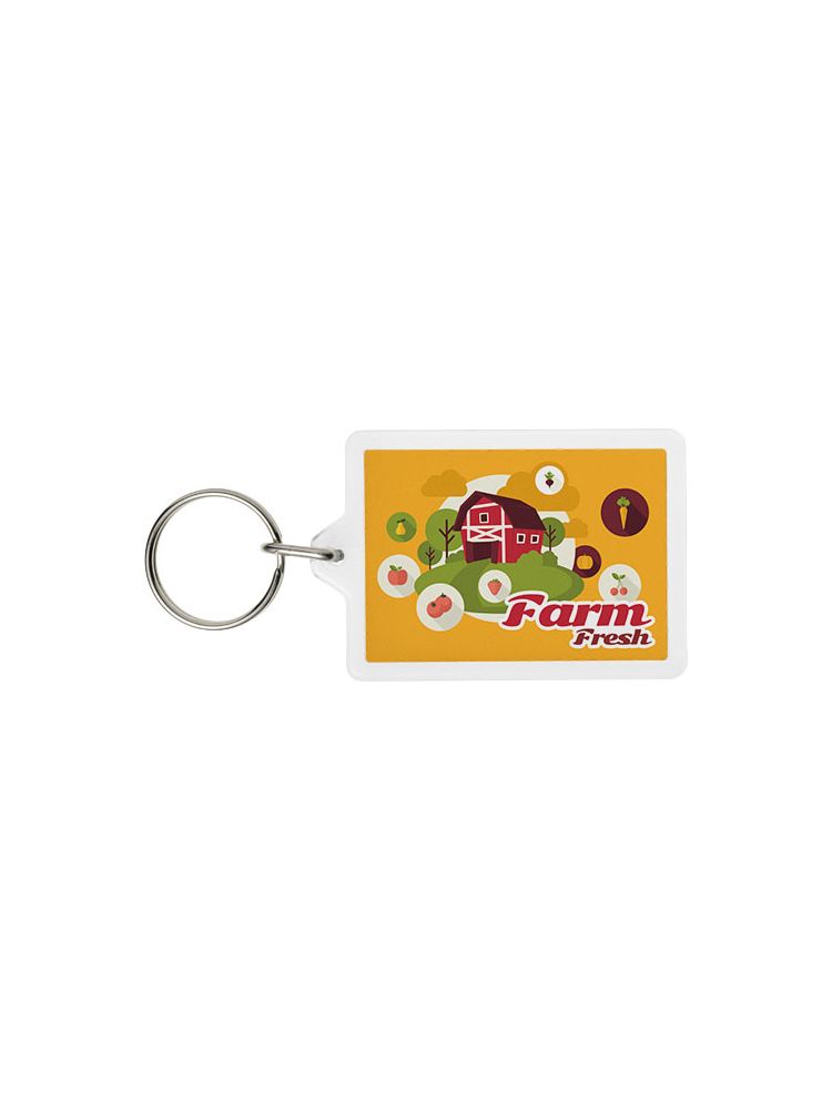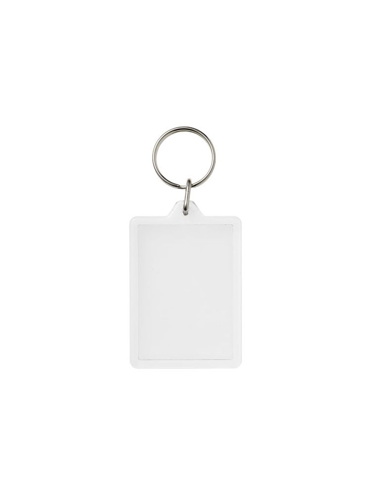 Prostokątny breloczek C1 z metalowym pękiem na klucze. Metalowy pierścień cechuje płaski profil, który idealnie nadaje się do wysyłek. Wymiary wkładu do druku: 5,0 cm x 3,5 cm.
