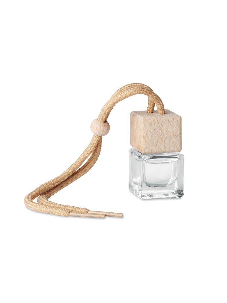 Odświeżacz do samochodu wielokrotnego użytku z dyfuzorem zapachowym z zapachem new car. Szklany pojemnik z pokrywką z drewna bukowego. Pojemność 5 ml.