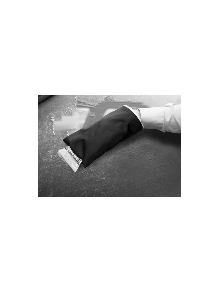 Skrobaczka do szyb z ochroną w postaci poliestrowej ocieplonej rękawicy.
