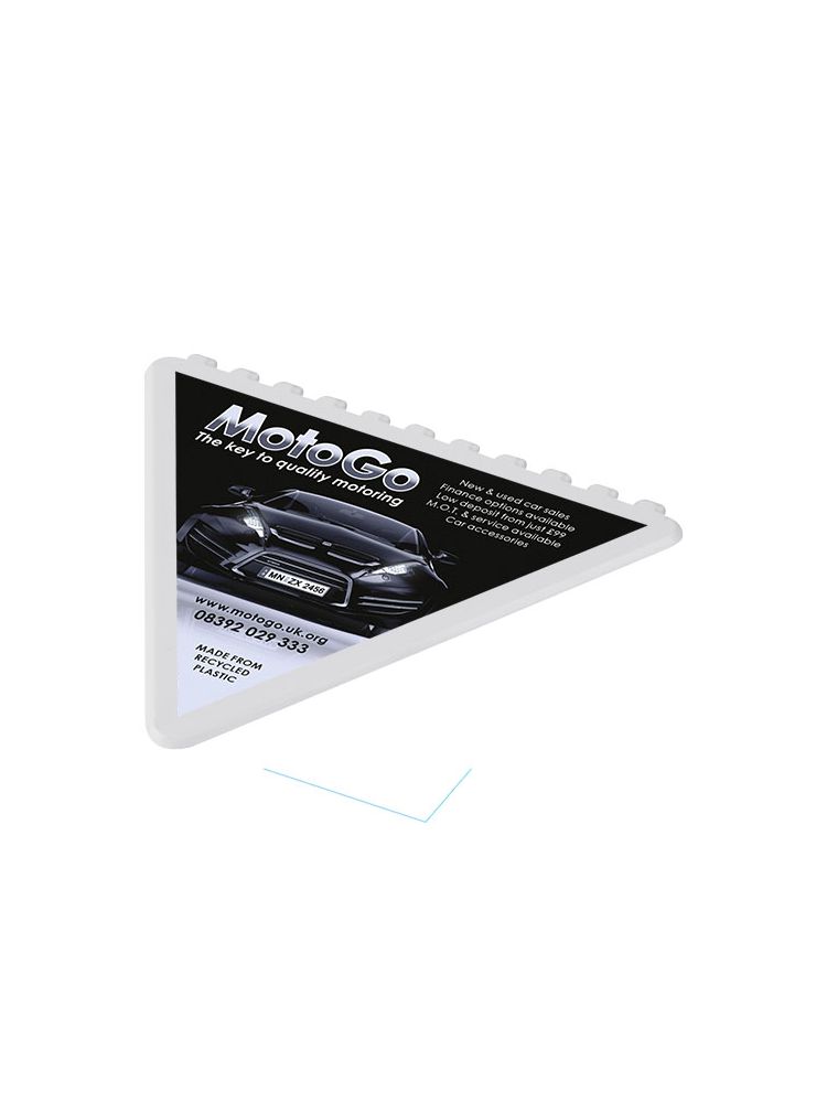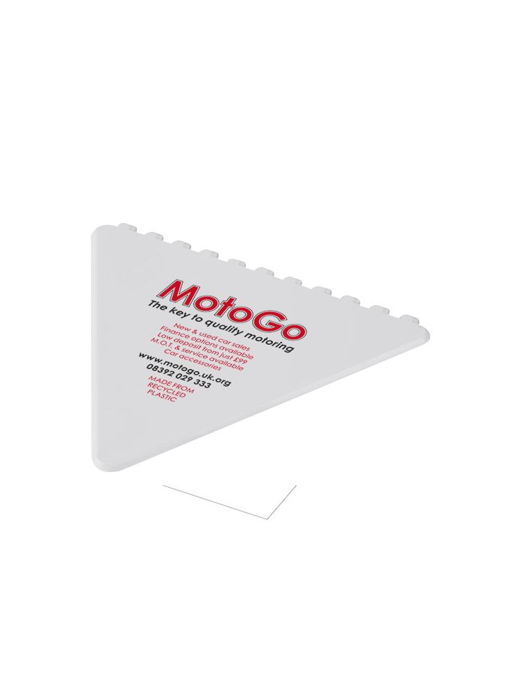 Trójkątny skrobak do skrobania szyby przedniej z dużym obszarem do dekoracji. Wyprodukowano w Wielkiej Brytanii z polistyrenu, tworzywa sztucznego pochodzącego z recyklingu.