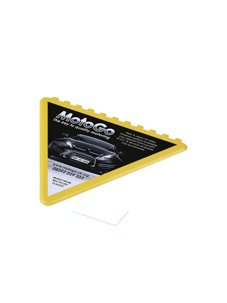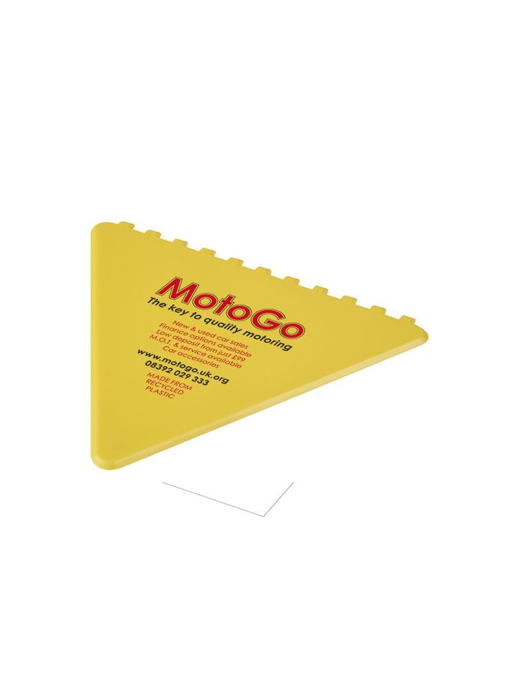 Trójkątny skrobak do skrobania szyby przedniej z dużym obszarem do dekoracji. Wyprodukowano w Wielkiej Brytanii z polistyrenu, tworzywa sztucznego pochodzącego z recyklingu.