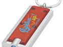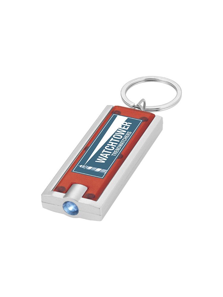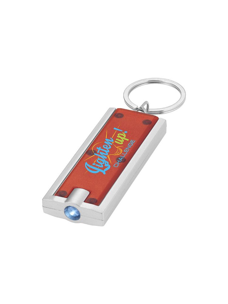 Brelok z białą diodą LED, włączany przyciskiem. Metalowe kółko do kluczy. Baterie w zestawie.